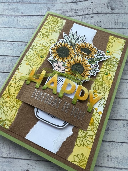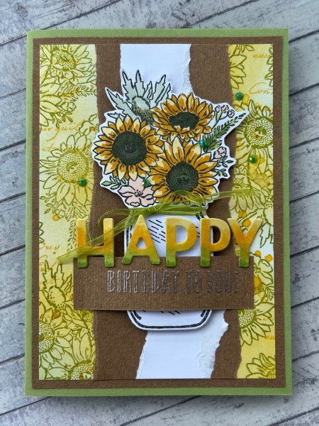 After the background was created I added some strips of Kraft and white torn cardstock and then the focal image of the same stamp and the jar, some pretty ribbon and the embossed sentiment with the die cut letters to finish off.