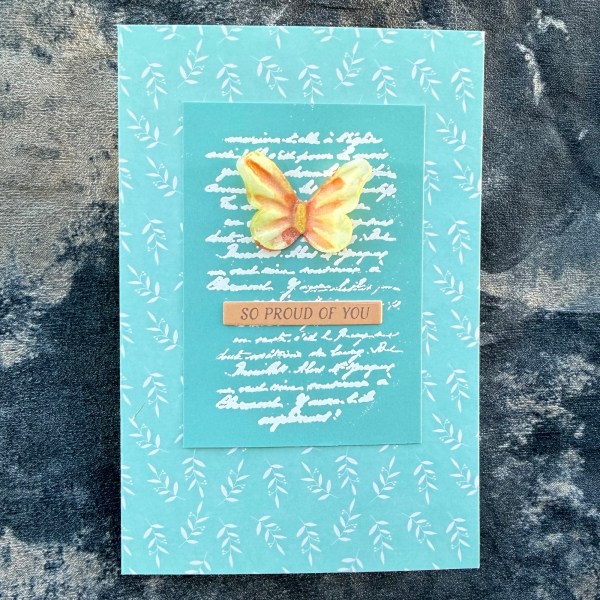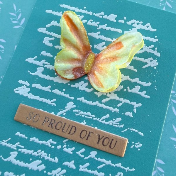 The card itself is one of those occasions card bases that Kingston Crafts had available last year (don’t think you can get them in the Uk at the moment) and then a panel of coordinating solid colour cardstock. I embossed some background sketchy scripty text stamping for the butterfly and sentiment to sit on with white.