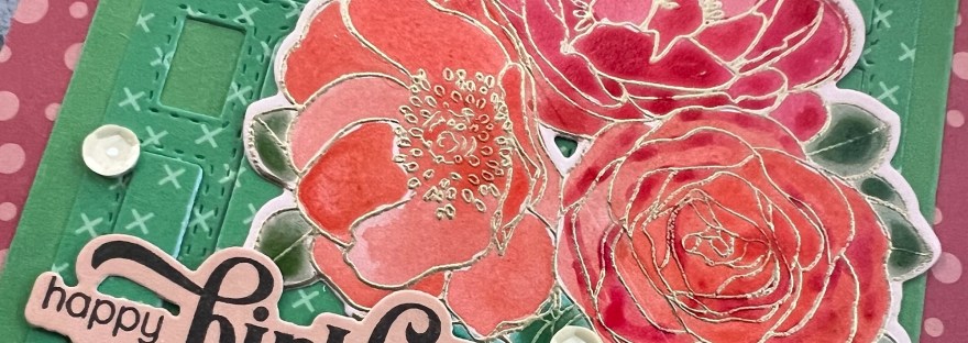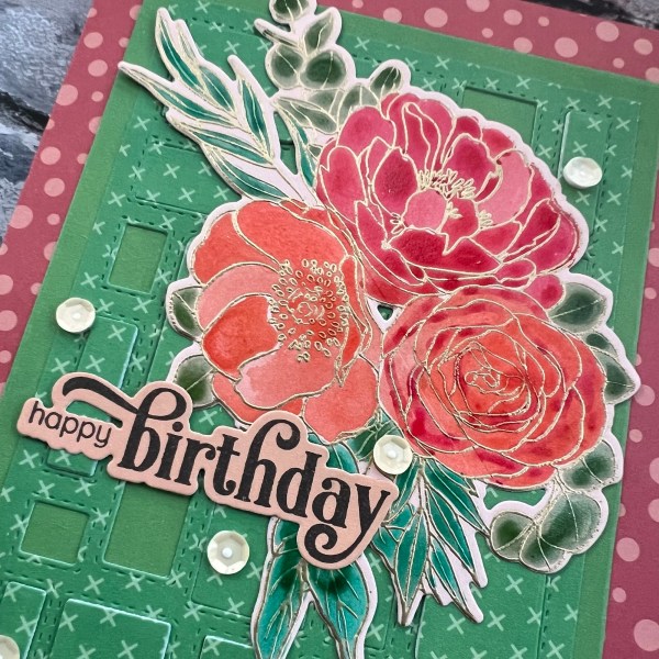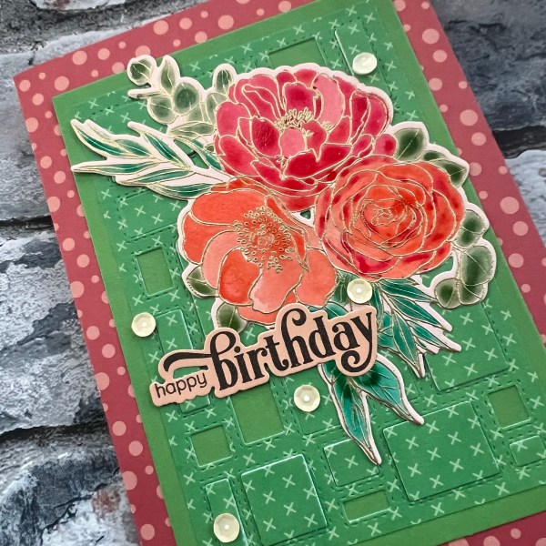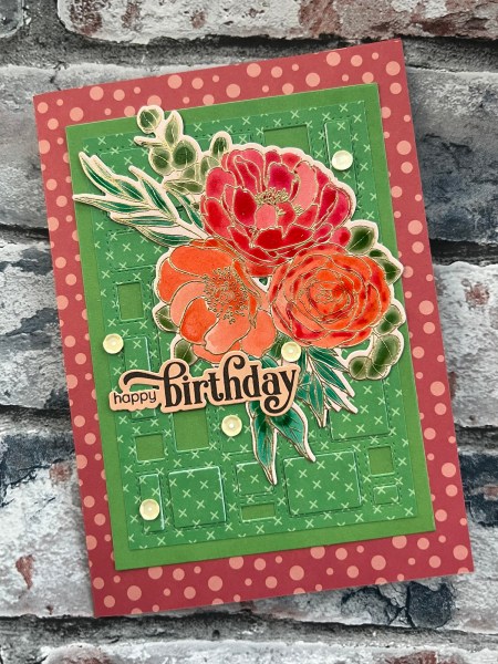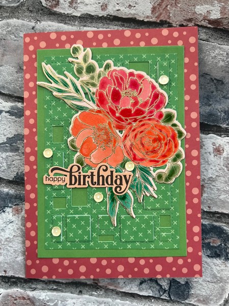 The colours I chose for the floral element based on the gorgeous red and coral spotted paper which I made the 5×7 card blank from to mount the green panel.