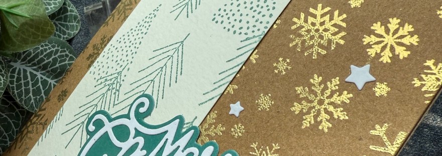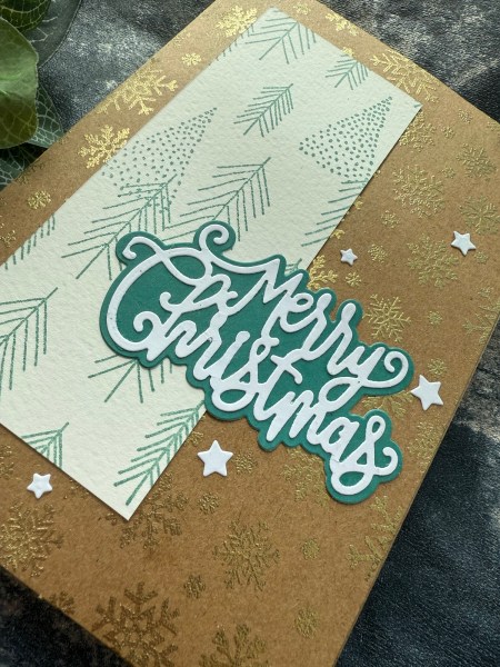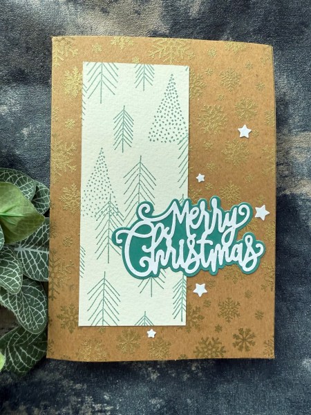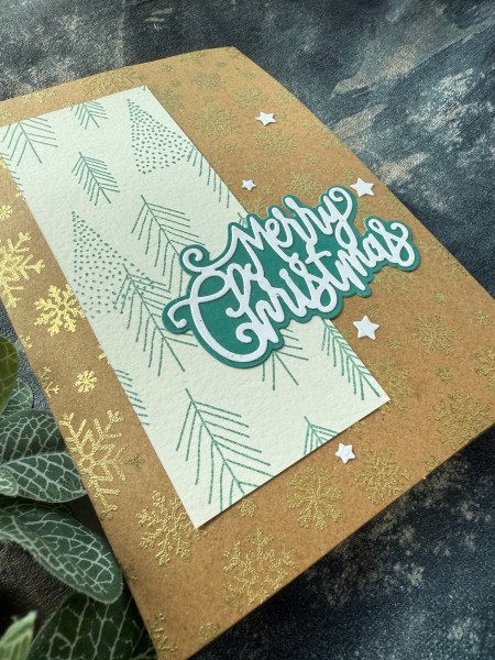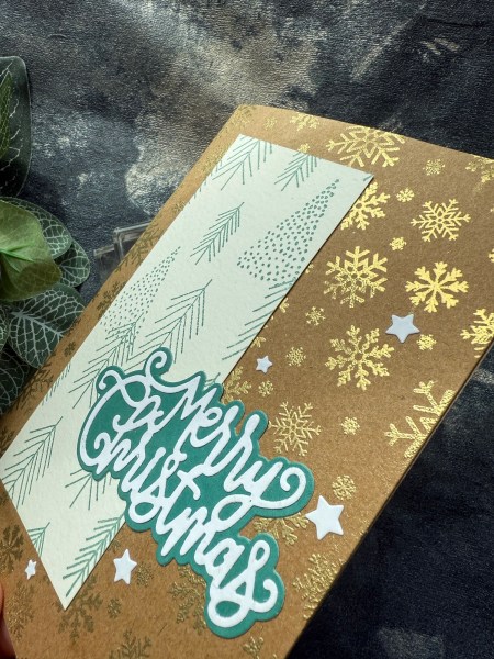 I means you can keep designs simple like this one – with the full Kraft card blank embossed with the gold snowflakes and then added a panel I stamped with the trees as a bit of contrast.