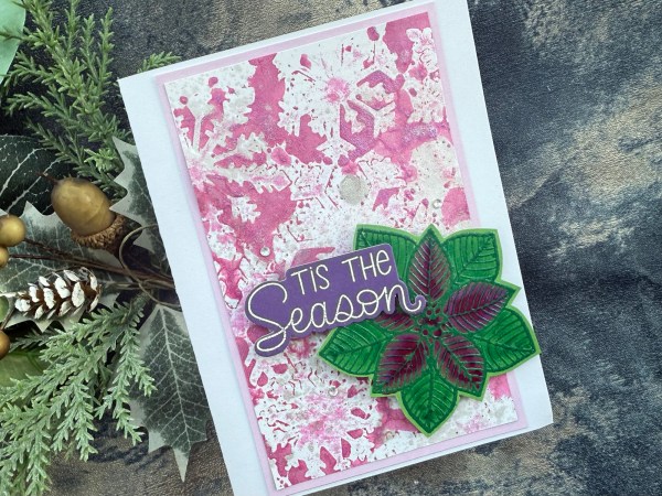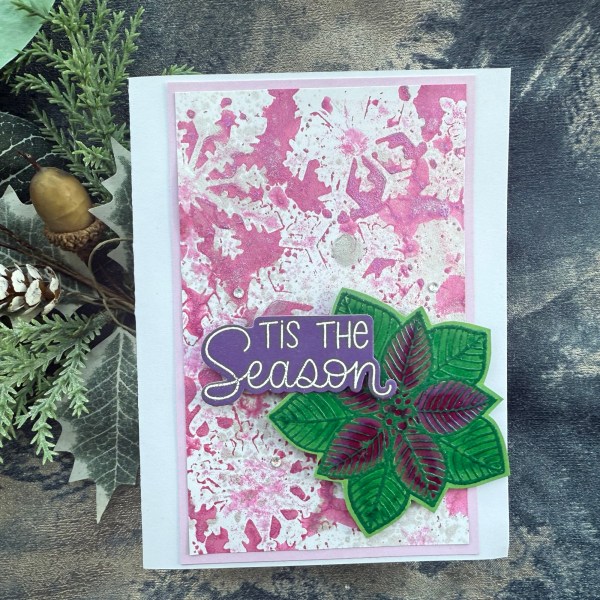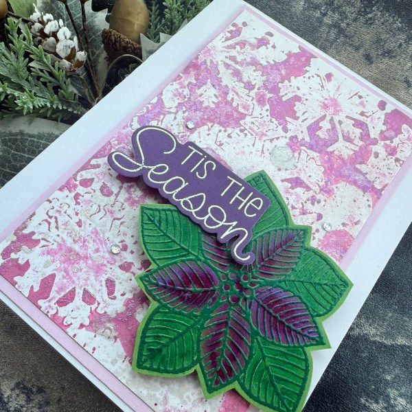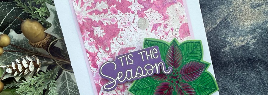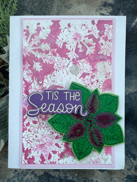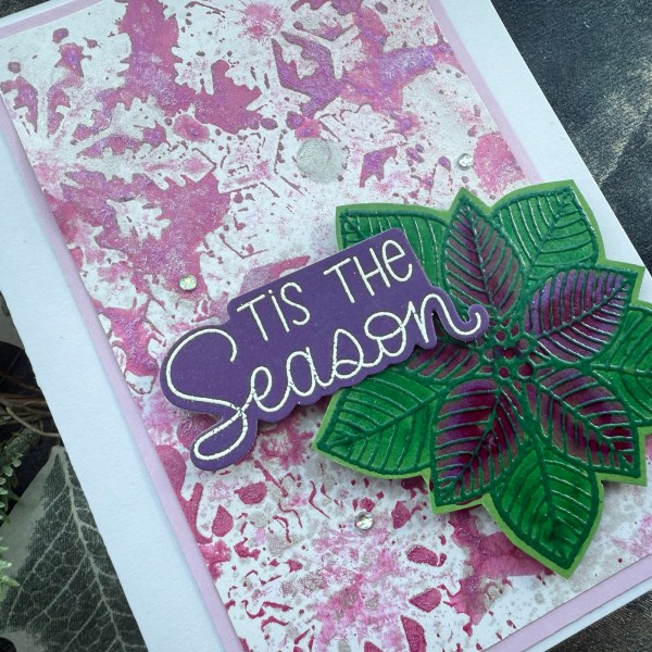 This card was made when I was testing out the Holiday shimmer spritz from Kingston Crafts and I had these pieces leftover – one is the gorgeous sugar plum which is a messy mop up paper from the spritzing through a stencil and the other is a stamped and embossed flower where I added colour by painting with the spritz – just gorgeous and super shiny!