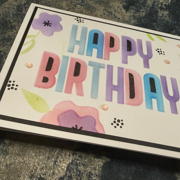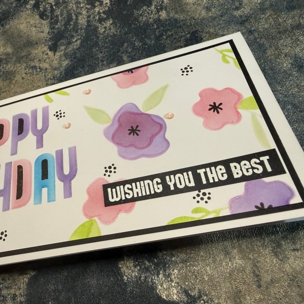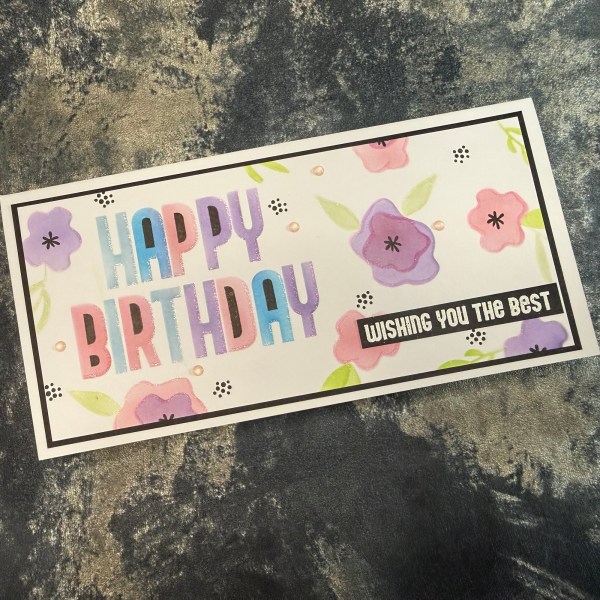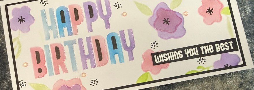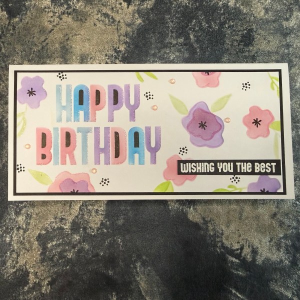 I chose to use an Altenew stencil and stamp duo that creates these fab letters and then also has the wobbly flower elements. So I cut myself a panel for a DL card and had fun selecting pinks, purples and blues for this card.