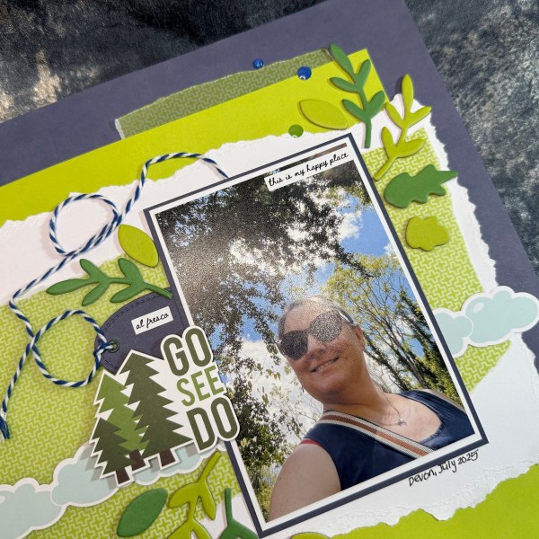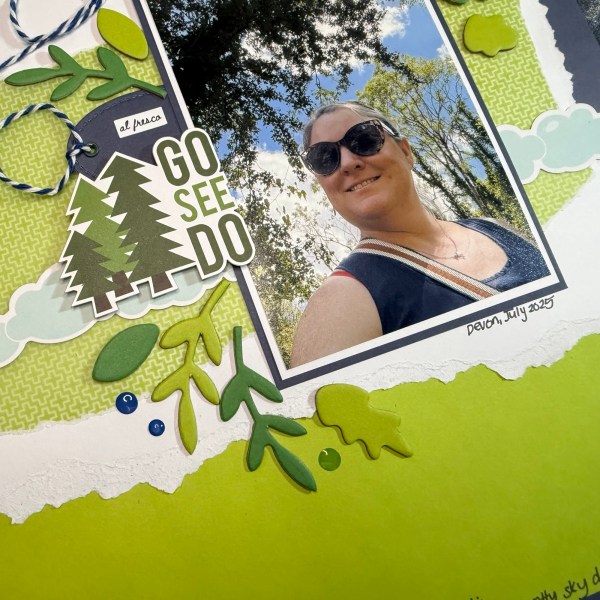 The basic design is as Sarah had it – although she had two photos whereas I just have the one. I added the green blended ink and the blue rub ons, the oval tag to the left of the photo, the ruffled trim below the photo and then the title.