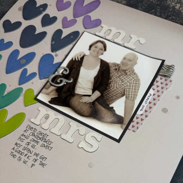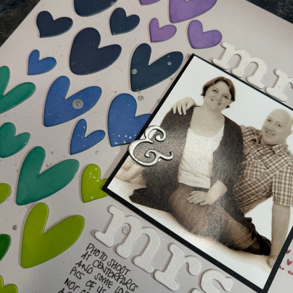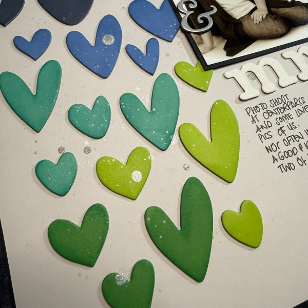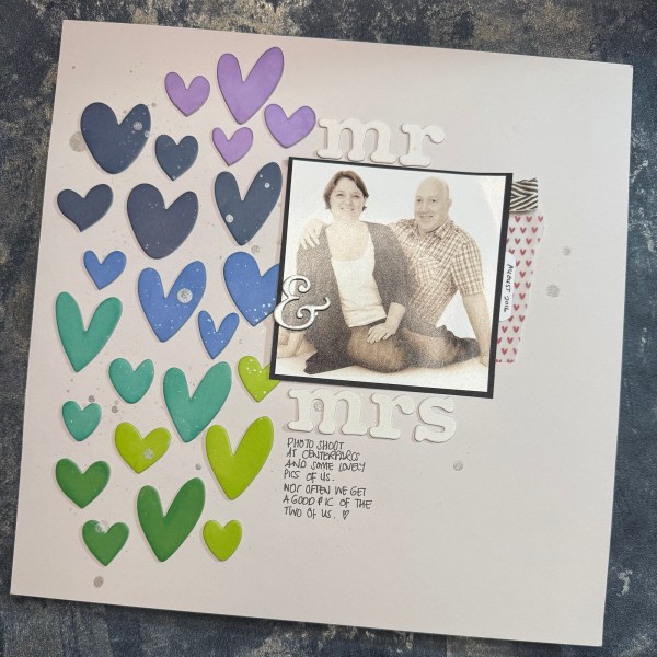 I wanted to make a scrapbook page with the heart chipboard shapes I had been given – I pulled out half of the colours for this page to make an ombré rainbow!