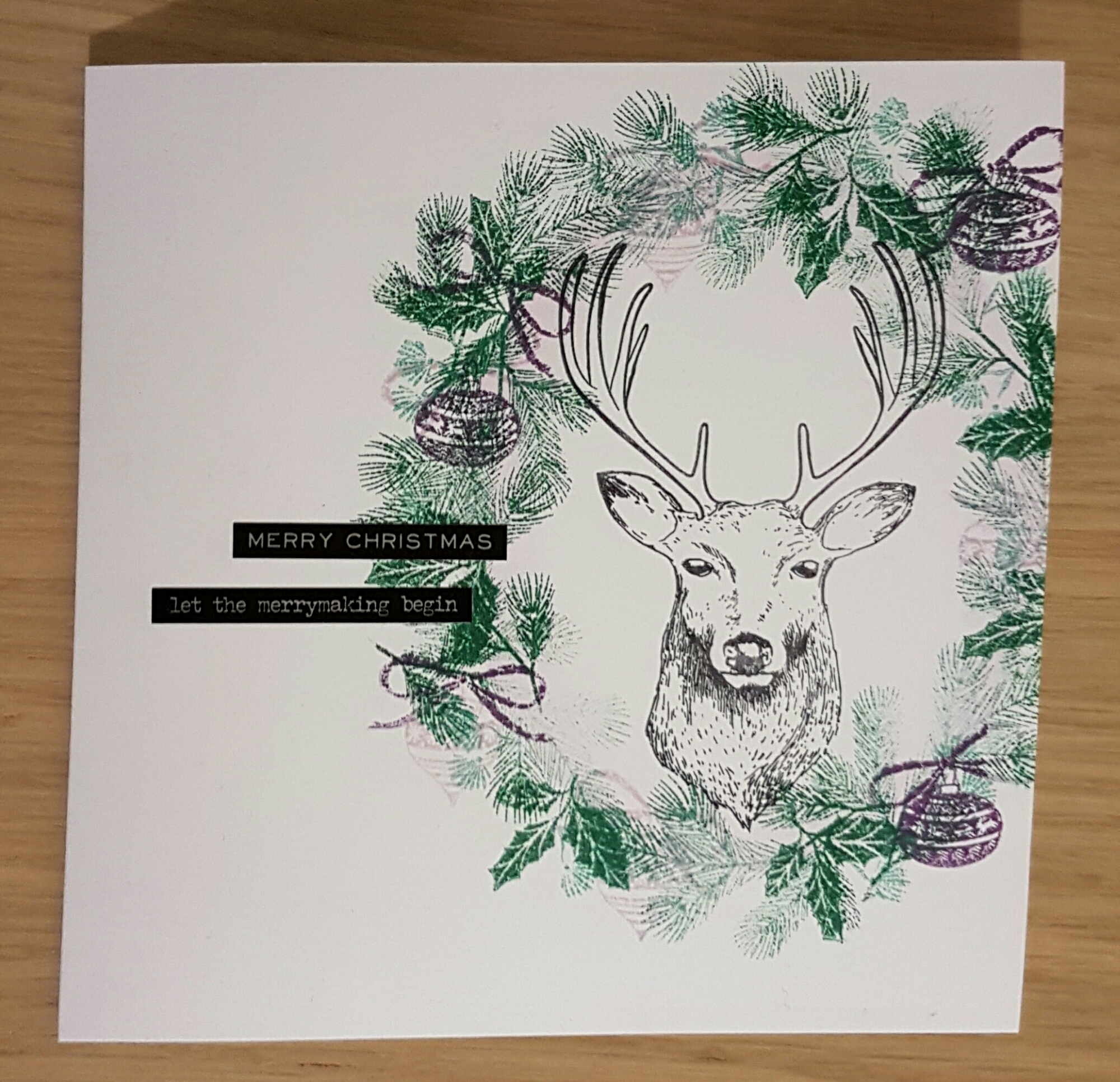 I used stamps from Creative Stamping magazine to provide the wreath and the beautiful stag illustration in different green and purple colours and finished it with some Tim Holtz sentiment stickers.
