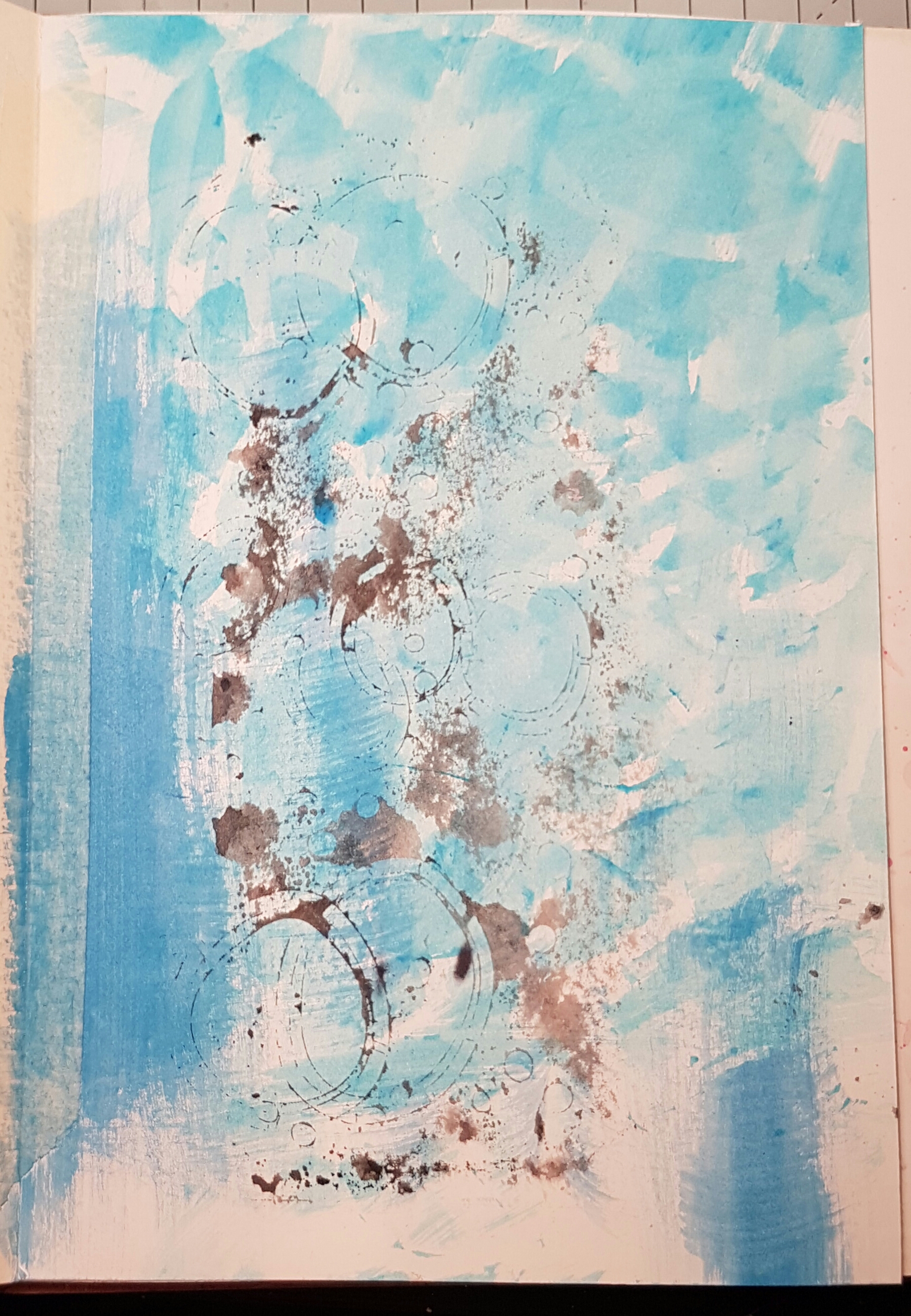 This was what the page looked like at the beginning… lots of wiping off of stencils and brushes. A perfect starting point for a watery background.