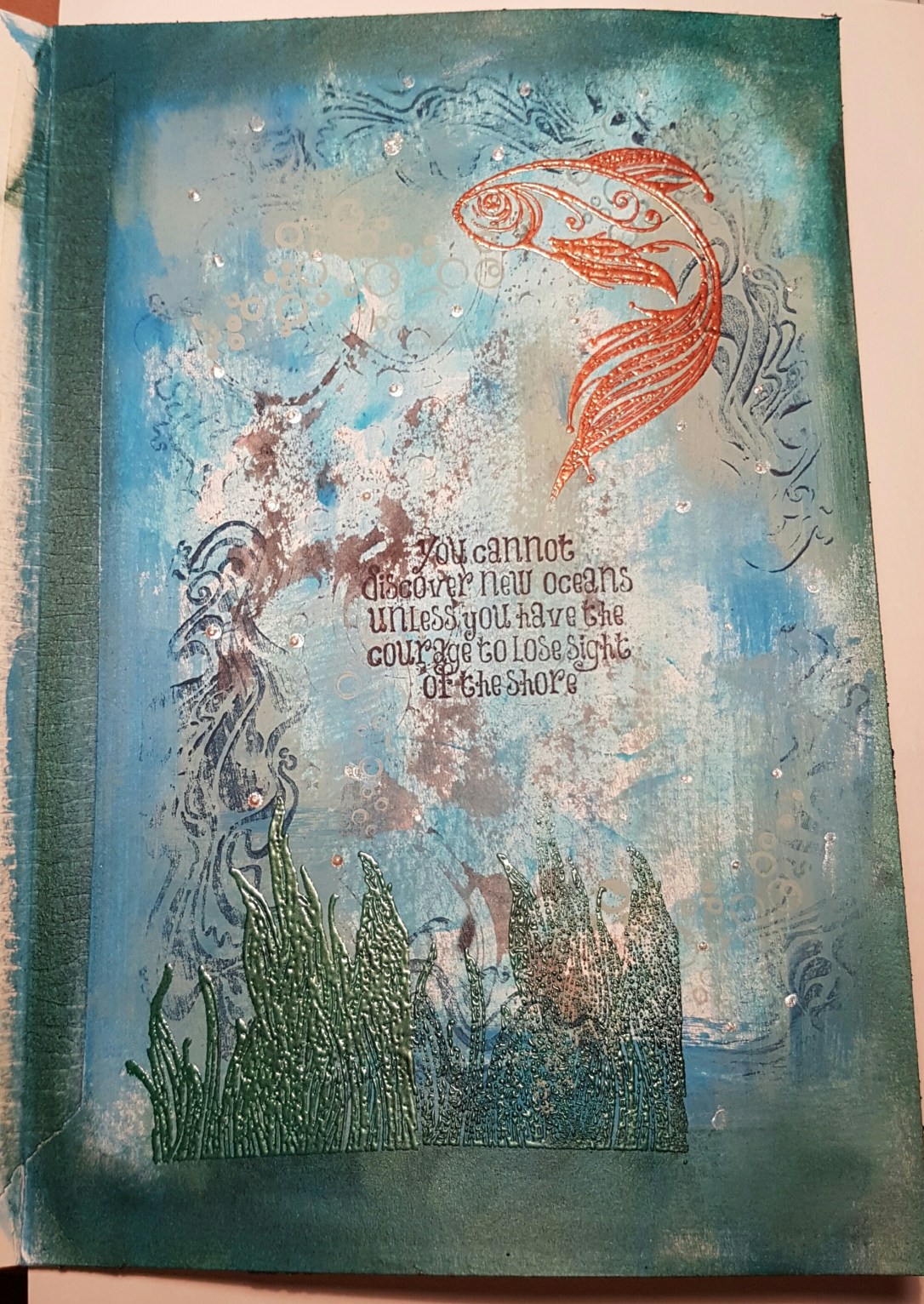 I added more paint and some painty stamping using the Indigo Blu stamps … then added the sentiment and the embossing of the fish and the seaweed. Then I finished with the little dots of liquid pearls and some gilding wax around the edge.