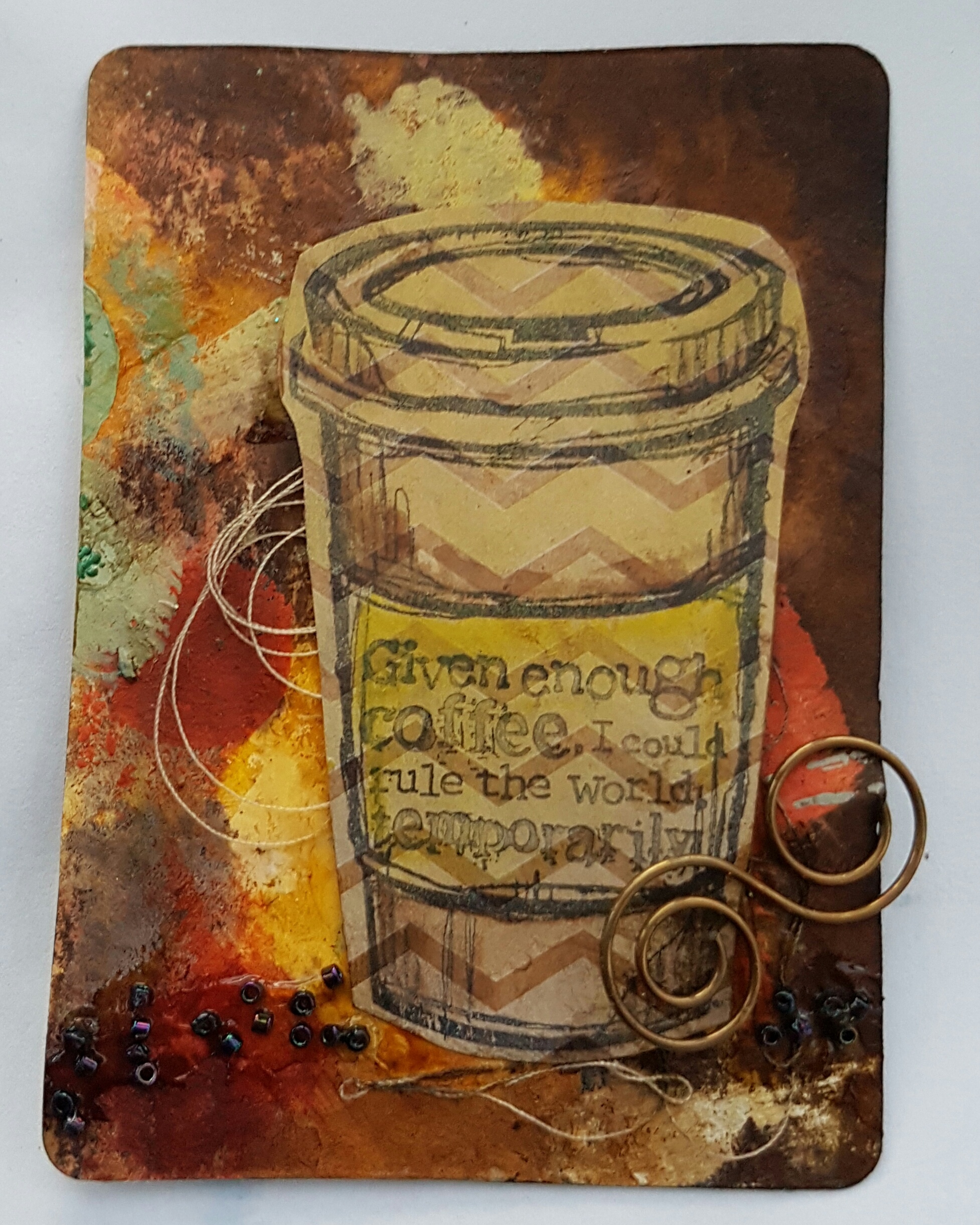 Week 3 was coffee… of course I had to use the perfect blend stamps… plus some beads and thread to add texture.
