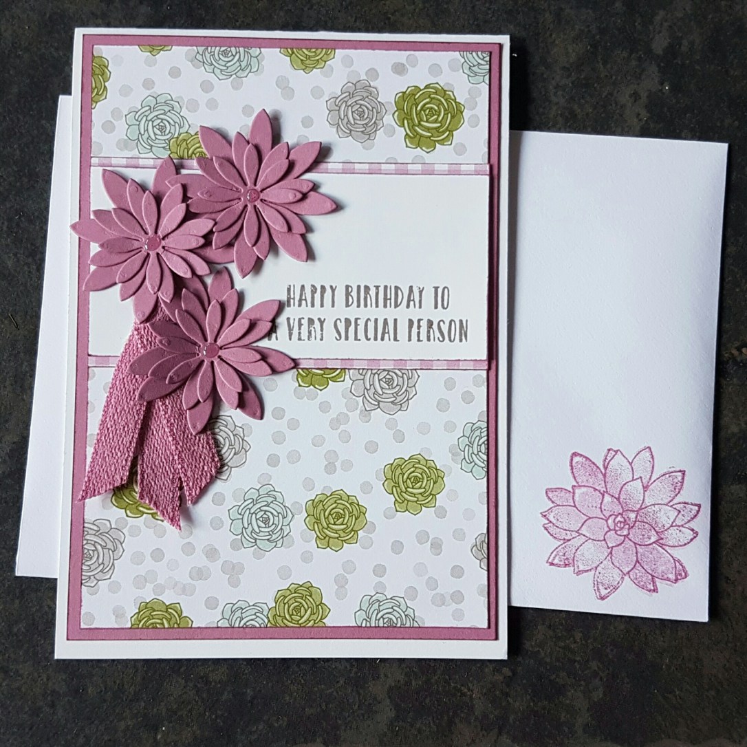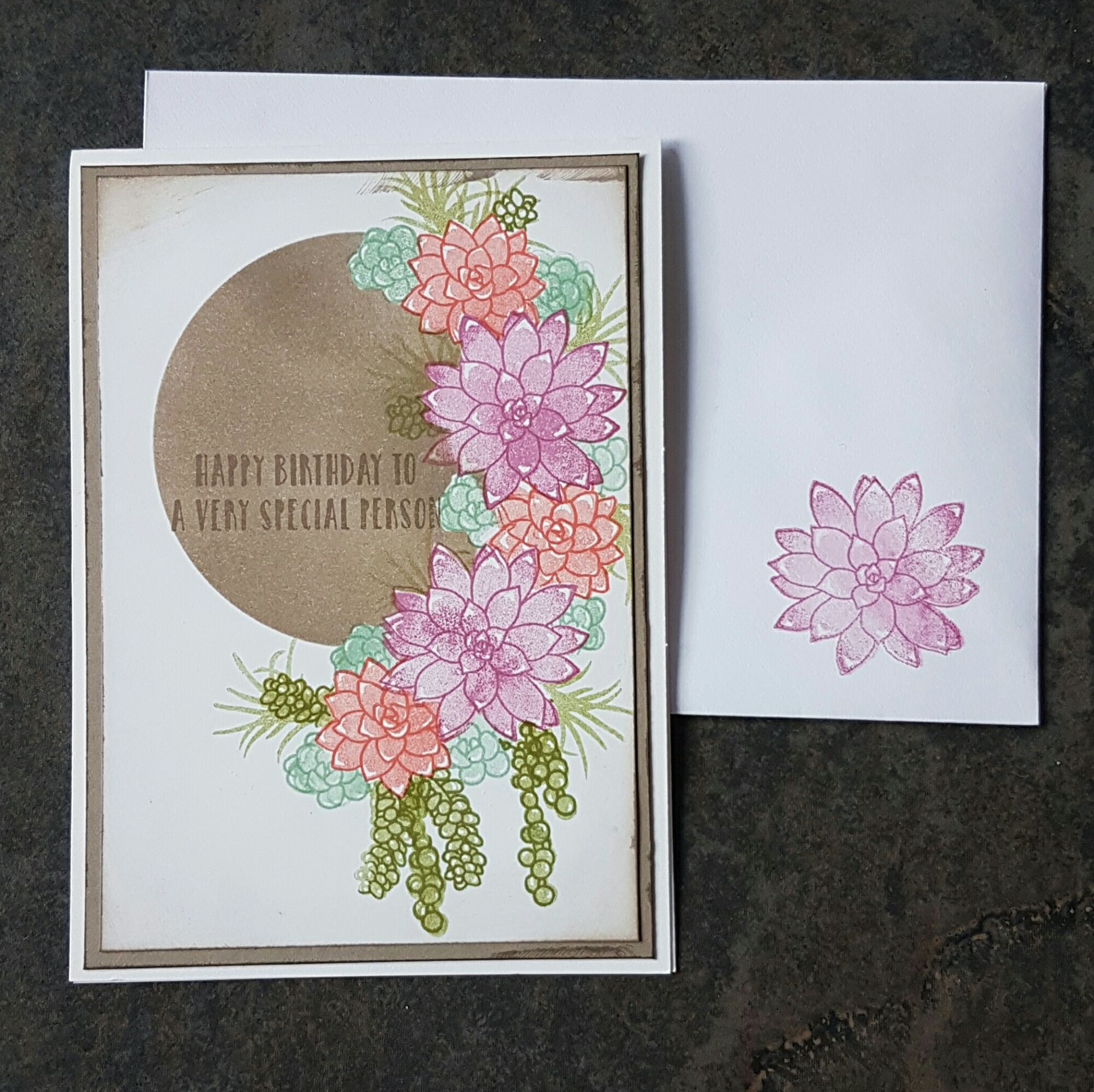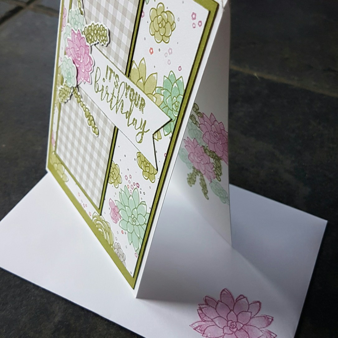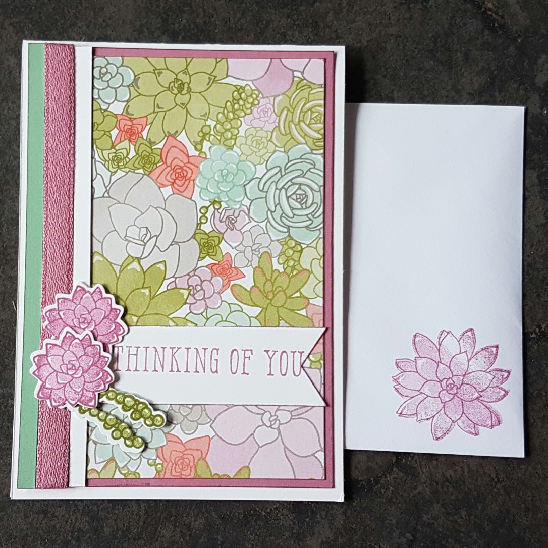 Yesterday I took myself out for the day to craft with my friend Helen who is a Stampin up demonstrator and great teacher. She had planned a one day class using some lovely products from the Oh so succulent range (Oh so succulent stamps and Succulent garden dsp) and we made cards to go in the tin that’s in the saleabration. I had a lovely day following Helen’s instructions (sort of!) and managed to make 7 cards and have oodles of supplies left to make more to go in the card tin… which I’ve planned to give as a gift to my auntie.