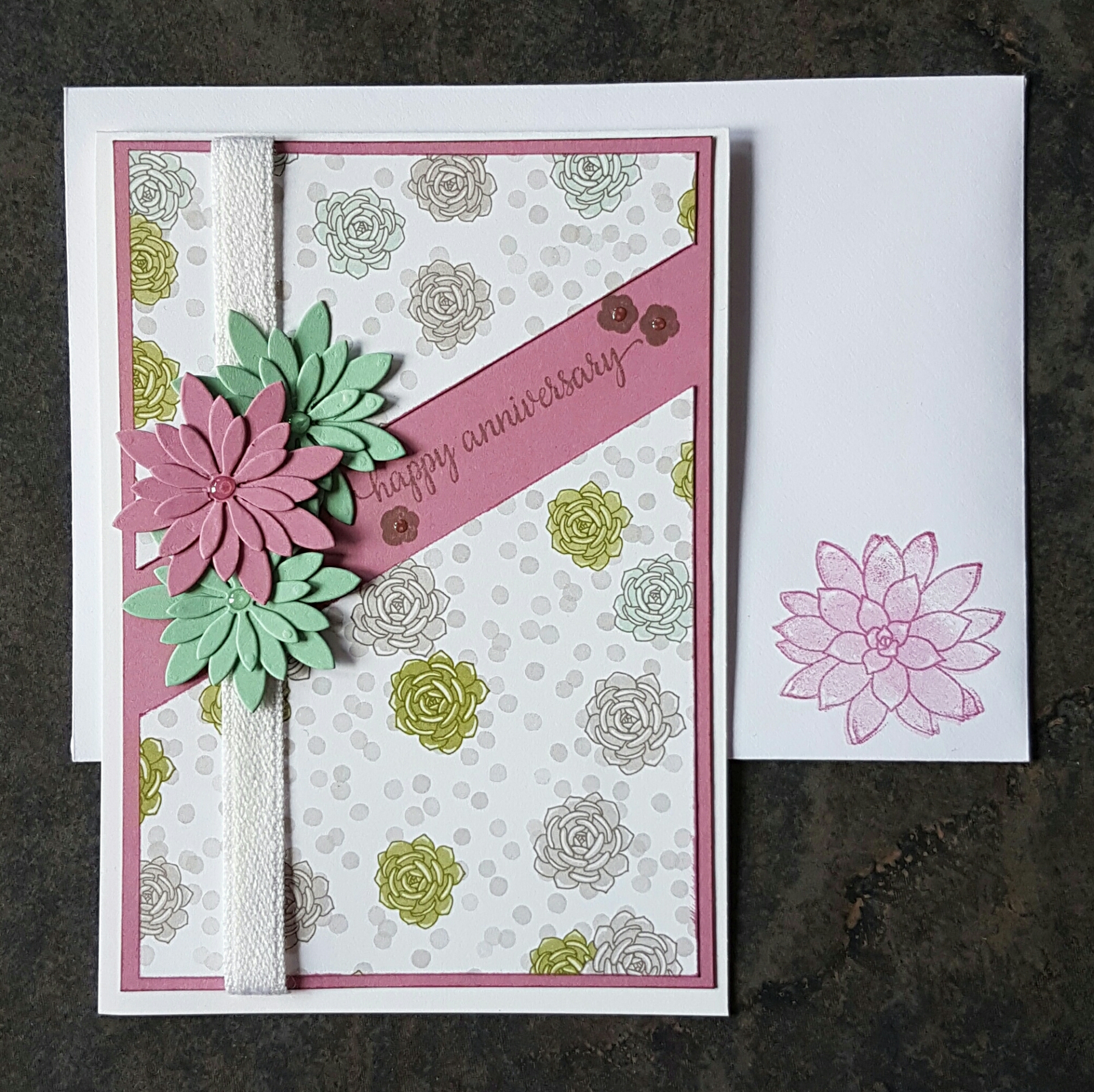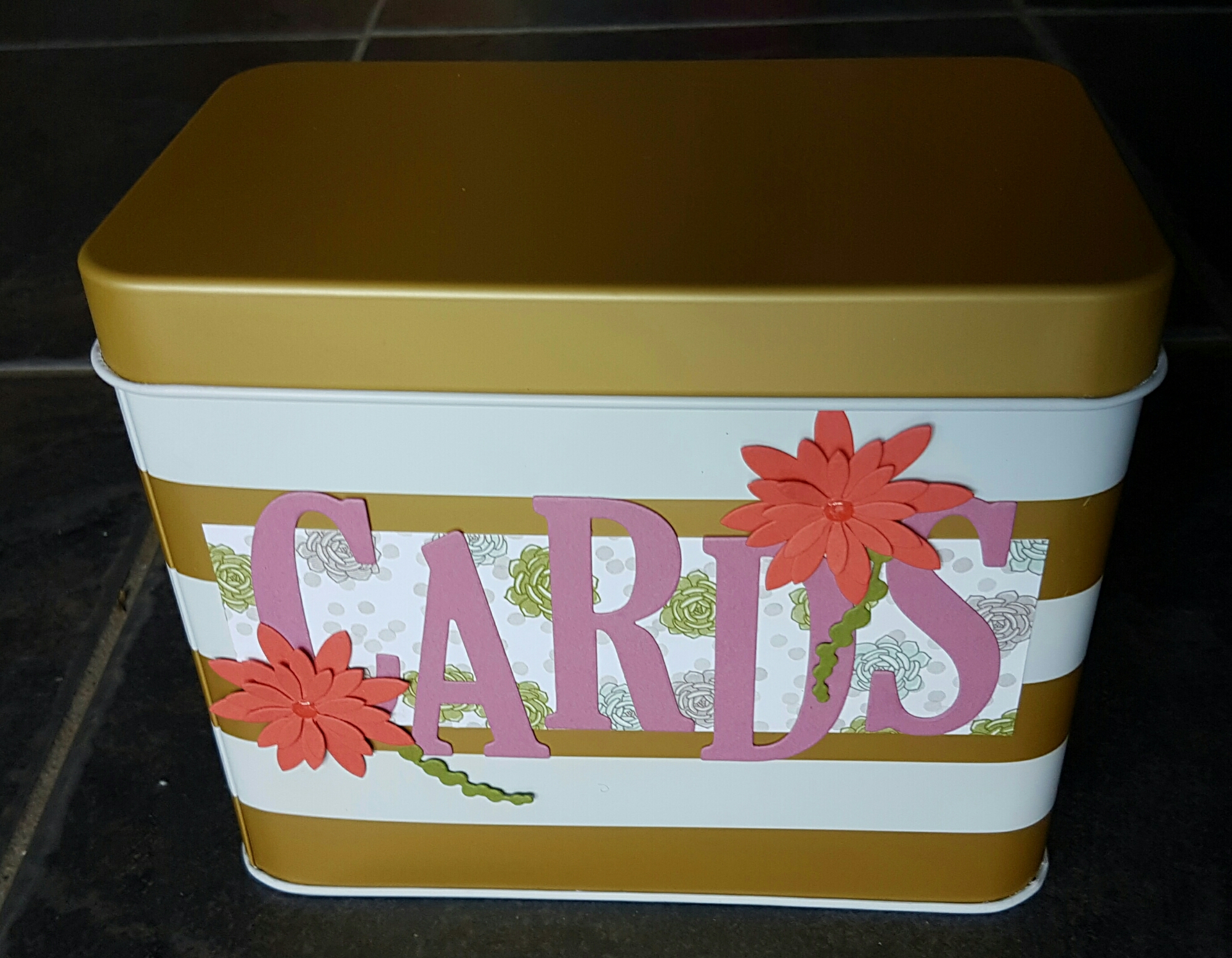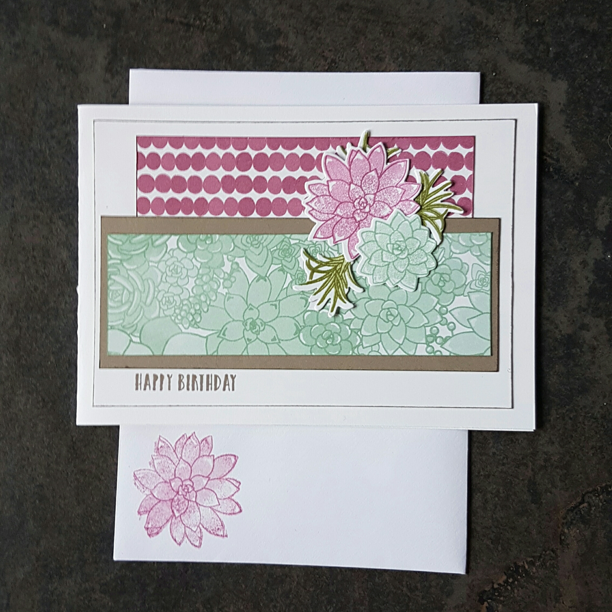 Yesterday I took myself out for the day to craft with my friend Helen who is a Stampin up demonstrator and great teacher. She had planned a one day class using some lovely products from the Oh so succulent range (Oh so succulent stamps and Succulent garden dsp) and we made cards to go in the tin that’s in the saleabration. I had a lovely day following Helen’s instructions (sort of!) and managed to make 7 cards and have oodles of supplies left to make more to go in the card tin… which I’ve planned to give as a gift to my auntie.