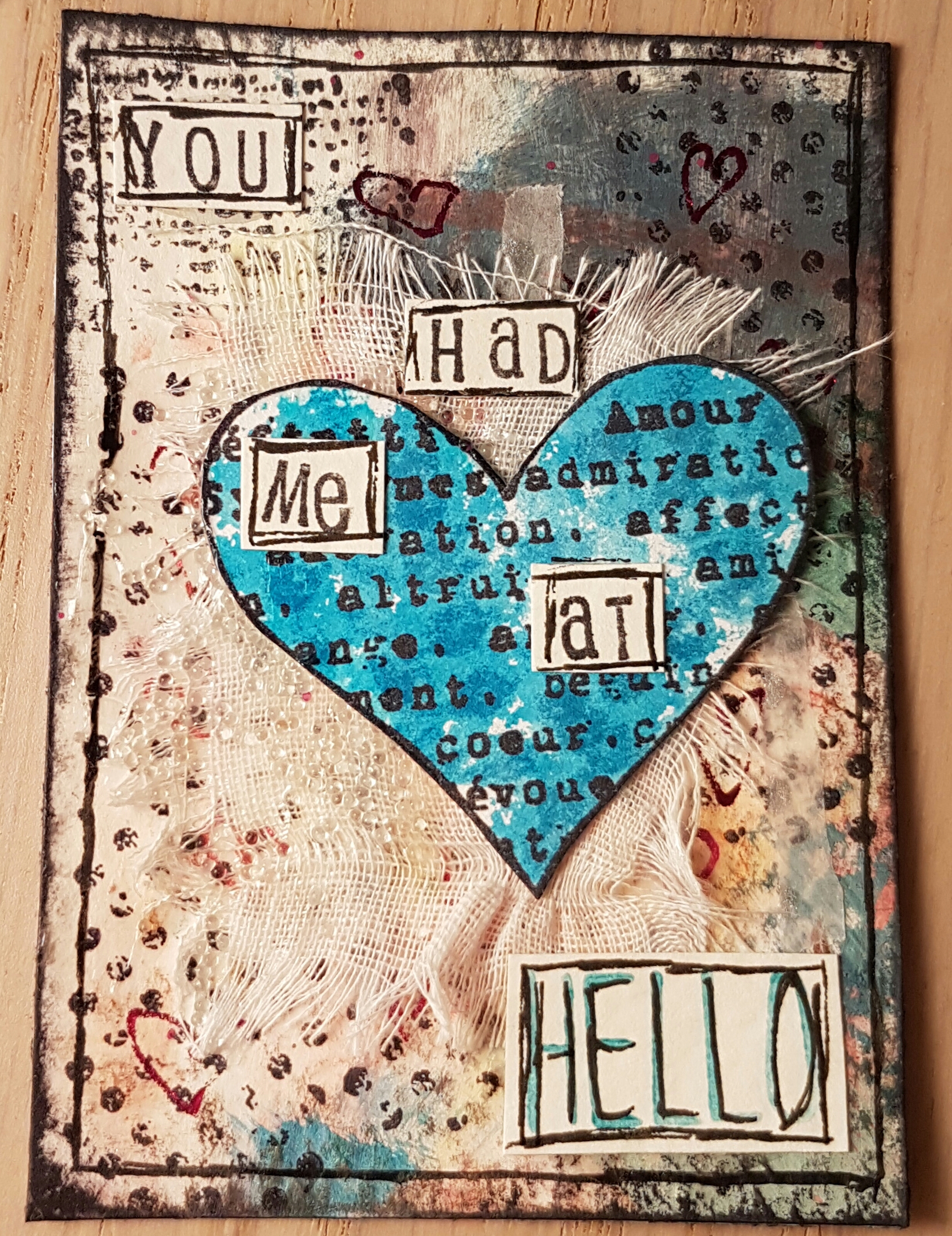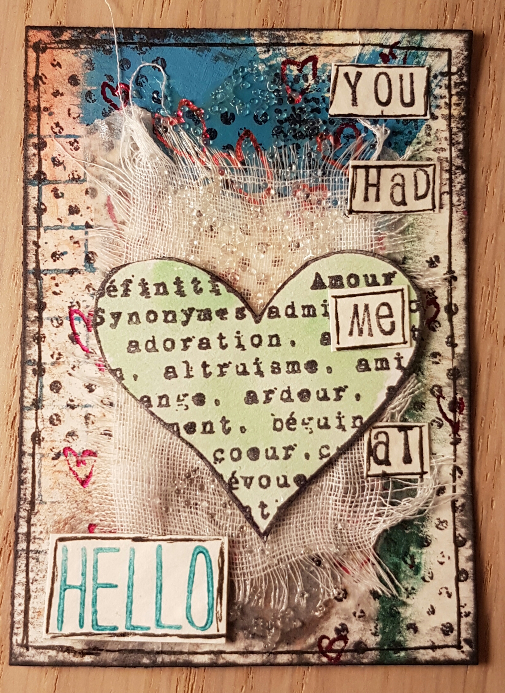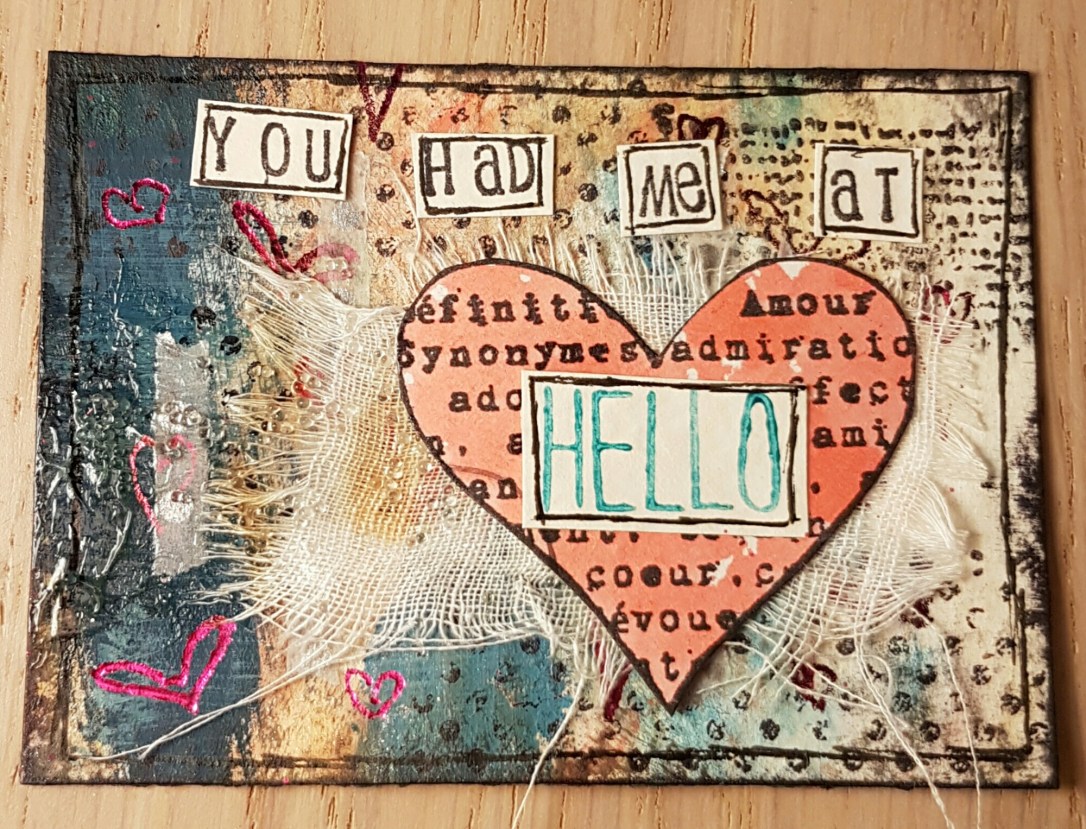 The swap theme is a memorable movie quote. I couldn’t get the “you had me at hello” from jerry maguire so decided to create three love themed ATC’S that are similar but not the same.