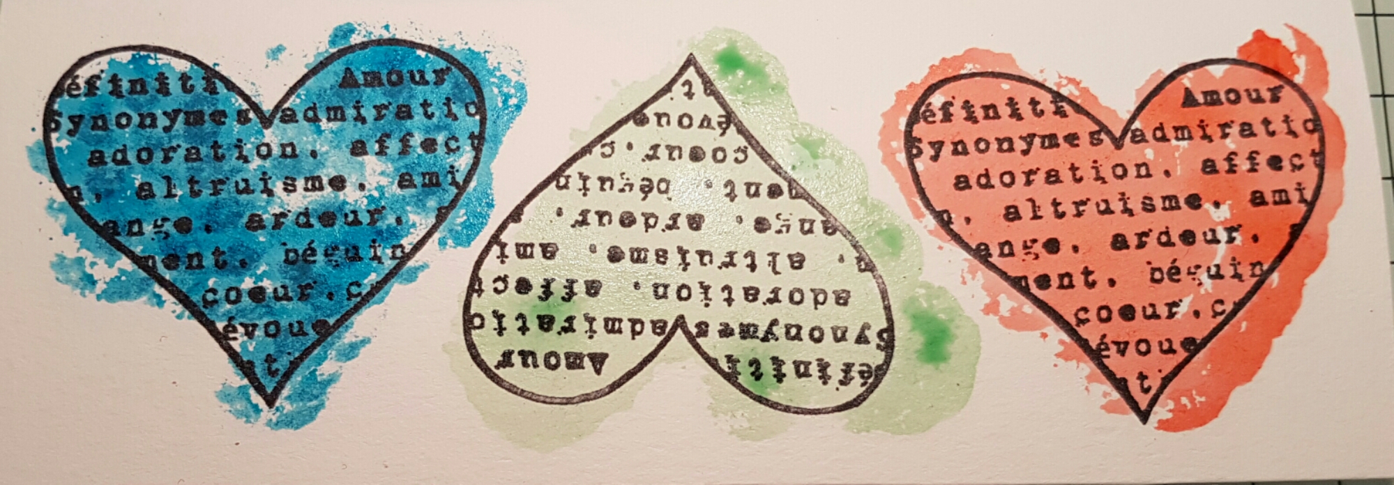 Now to chose the focal image.  I decided to use my favourite Darcy heart stamps. I coloured each of them differently using distress stains.