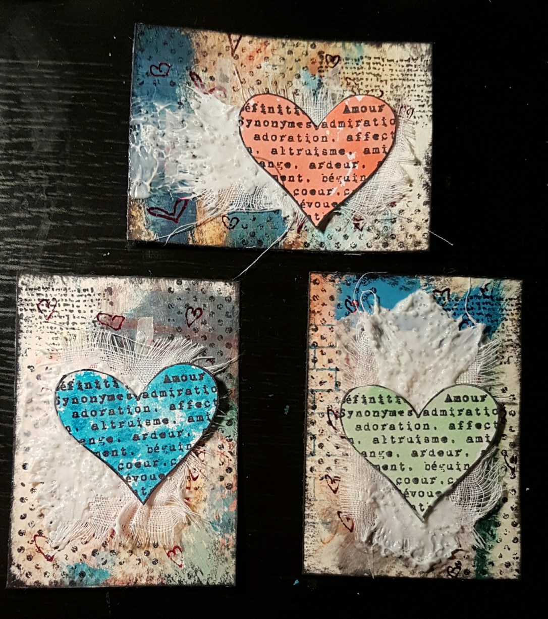 I added some layers of muslin and glass bead gel before adding the hearts and letting it dry.