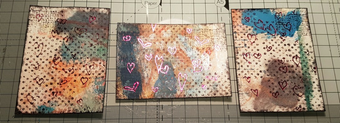 So I chose three parts of the cardstock and cut out the necessary 2.5 x 3.5 atcs and started adding pattern and texture.  I started with some foiling and drawing little hearts all over the cards I then added some texture stamps and inked the edges.