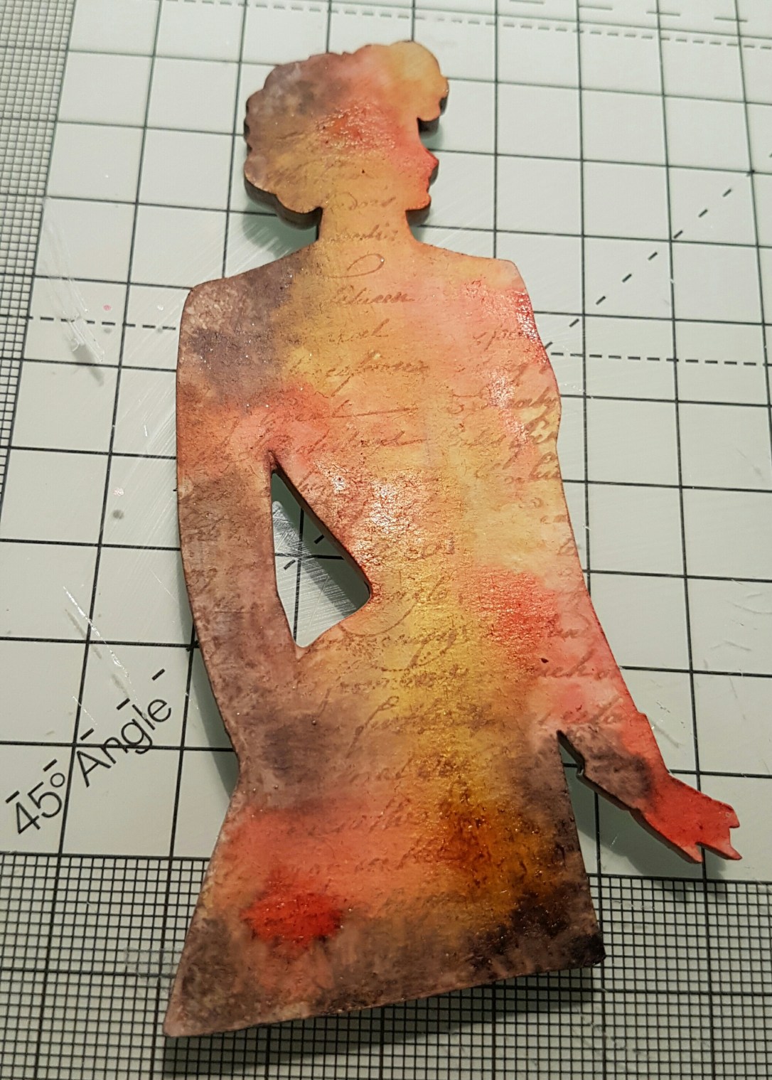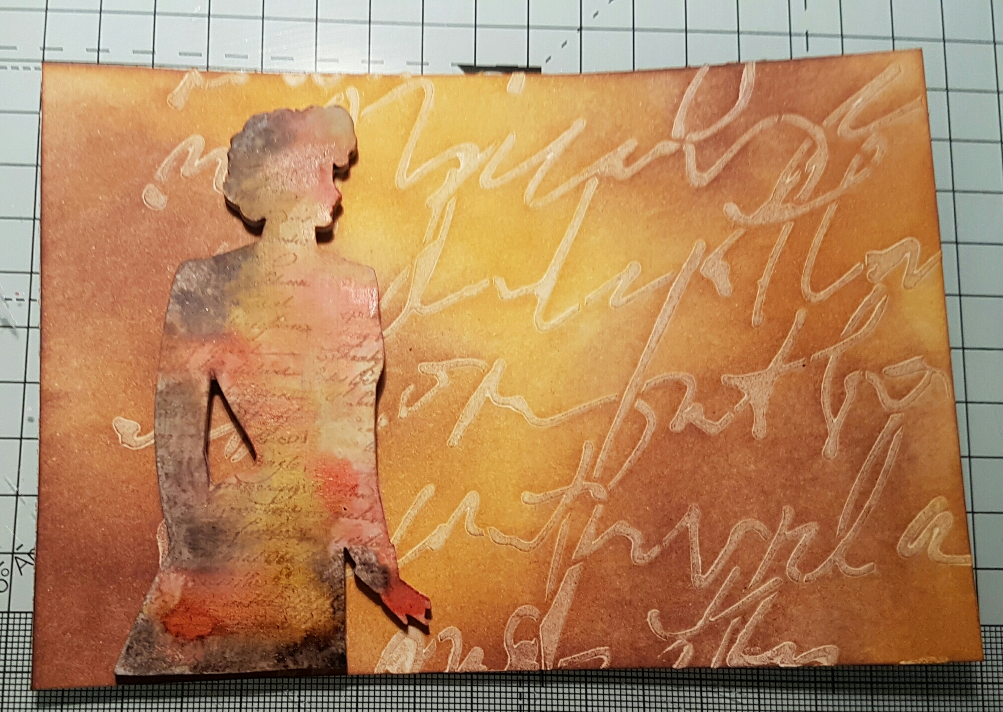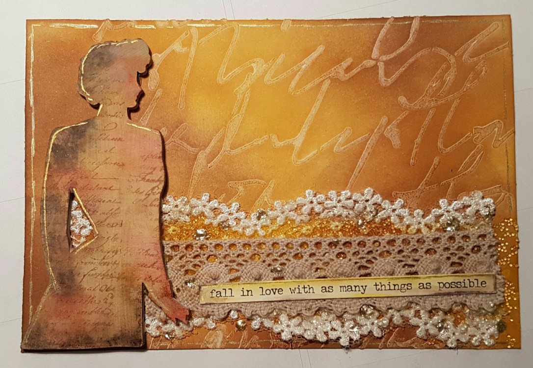 Whilst it was drying I decided to use one of the Wendy Vecchi art parts I bought in the sale ages ago for the main feature. I covered the lady in gesso then stamped script in archival sepia and then added distress stain in several layers.