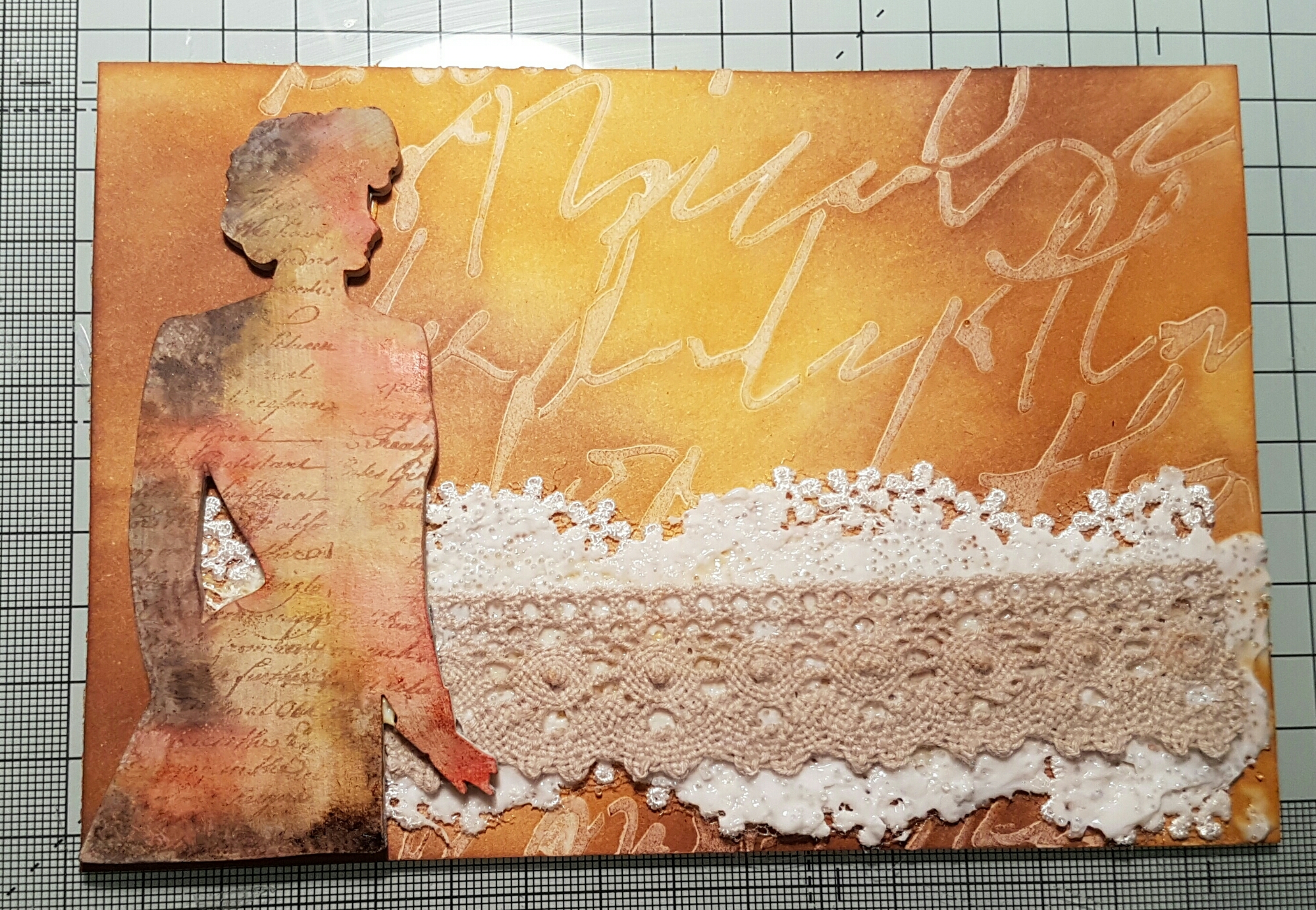 I chose a piece of very wide lace and some trim and decided to add some glass bead gel too. This was it still wet. I also added the lady using silicone gel glue.