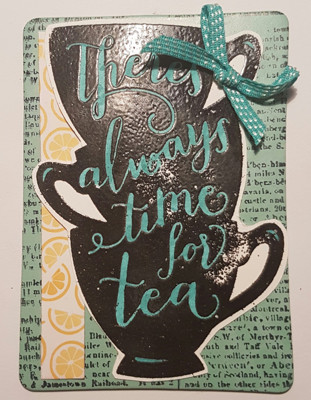 I can’t remember the stamp set name or the dsp the strip of lemons comes from but the technique we used was black embossing and then colouring the words in.