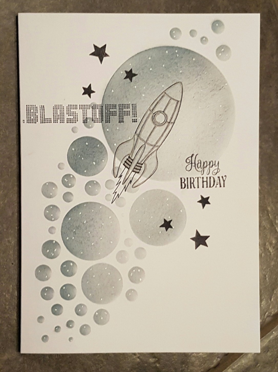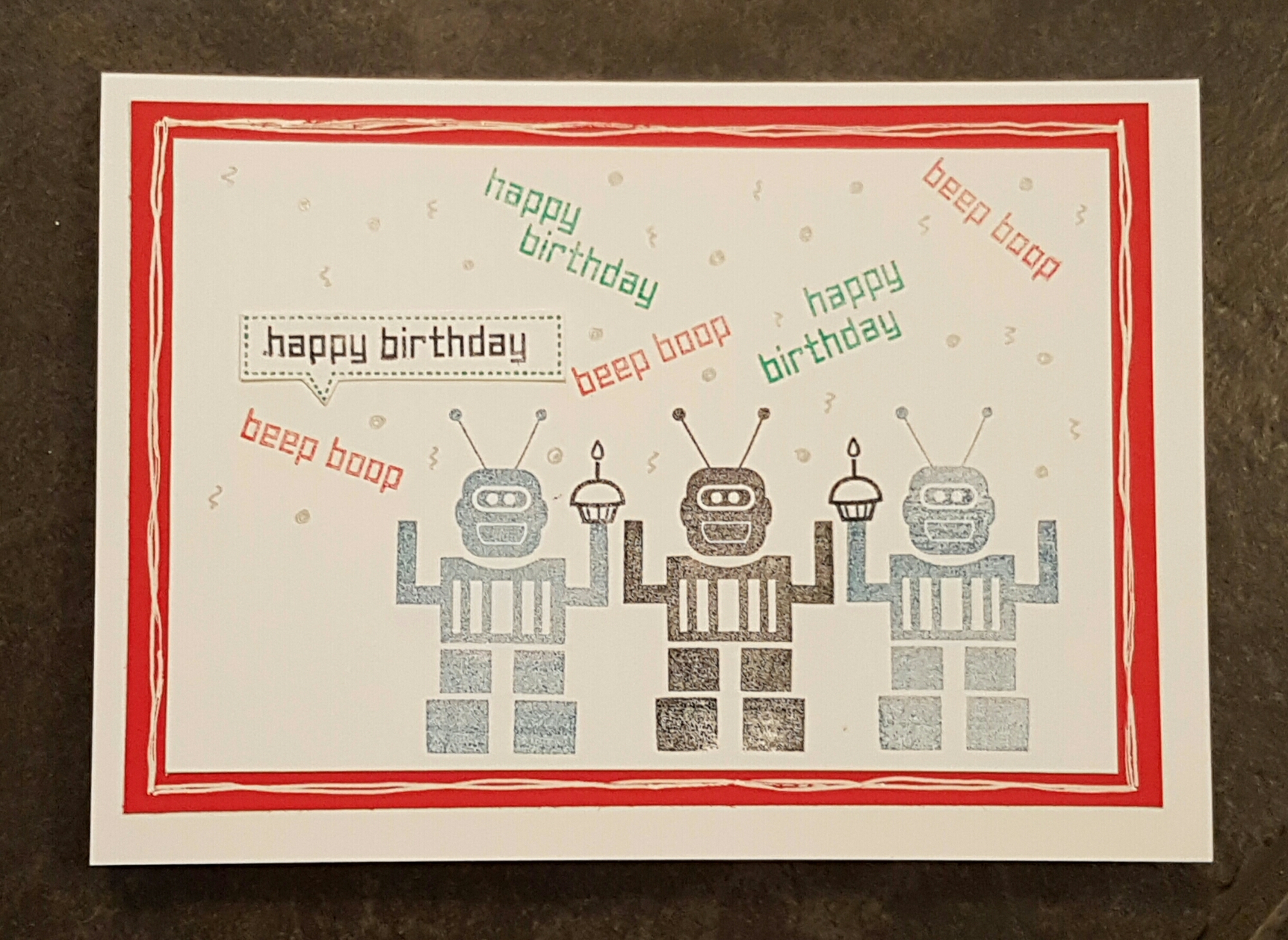 A change of pace tonight and instead of atcs I have some cards to share. I am not the biggest fan of making cards for males… they don’t seem to appreciate pretty things like flowers and ribbons and bling! Grrrrrr… so I have instead resorted to robots and spaceships!