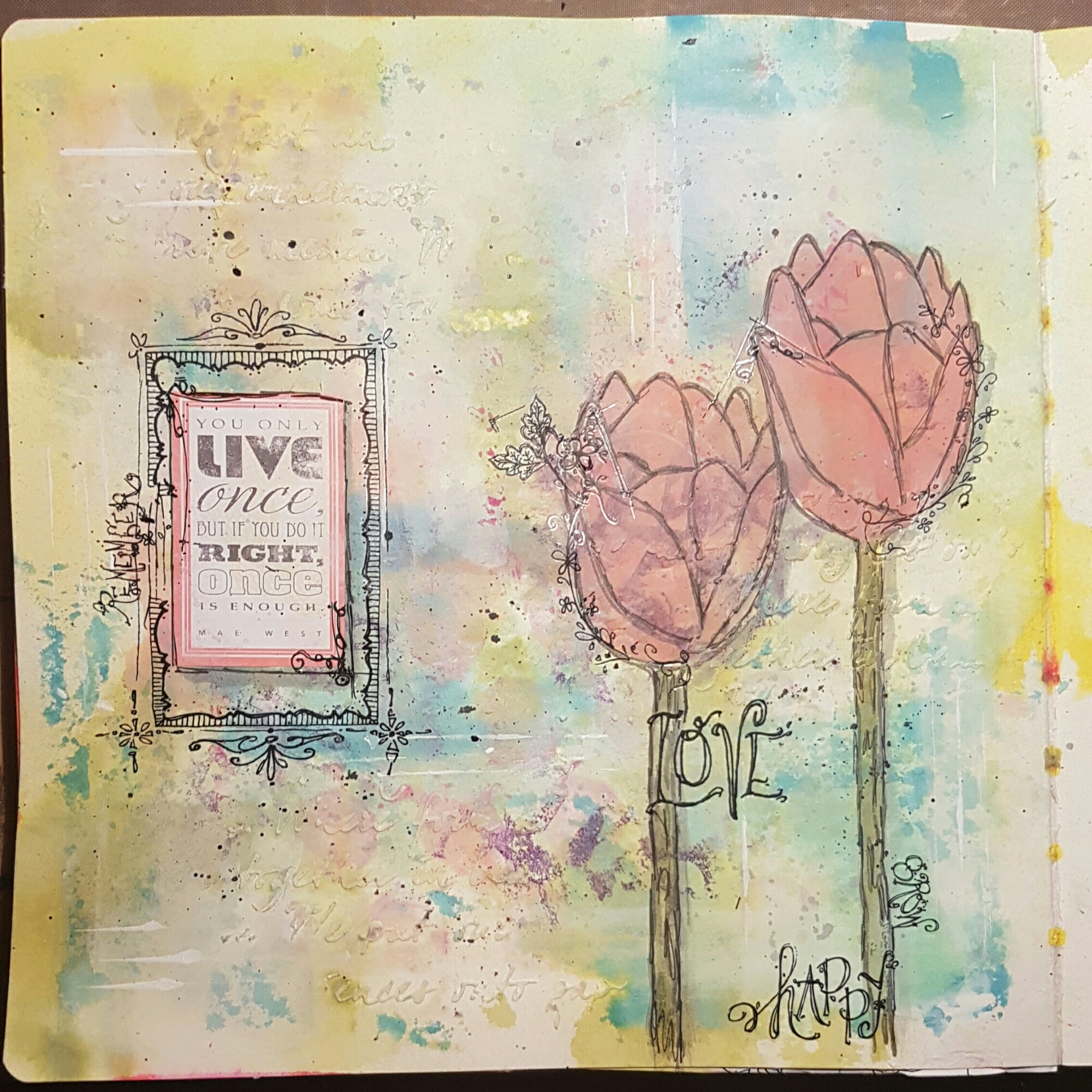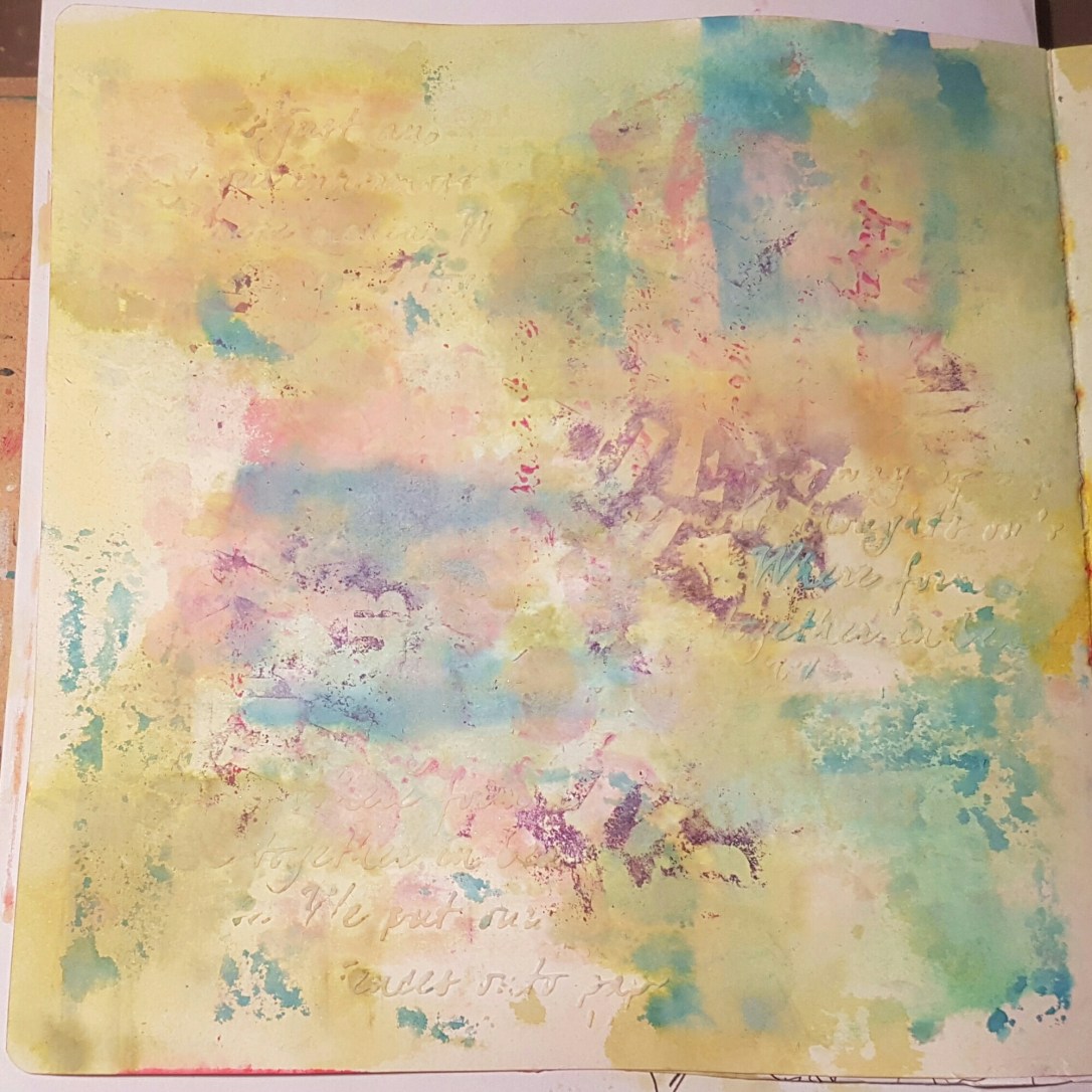Once I had done the initial water spray I dried the page and then started adding more ink using the smooshing packaging application that Missy Widden uses in her YouTube videos. This softened and blended the colours and the beautiful oxide inks give such a pretty and chalk type look when they have been wet and dried.