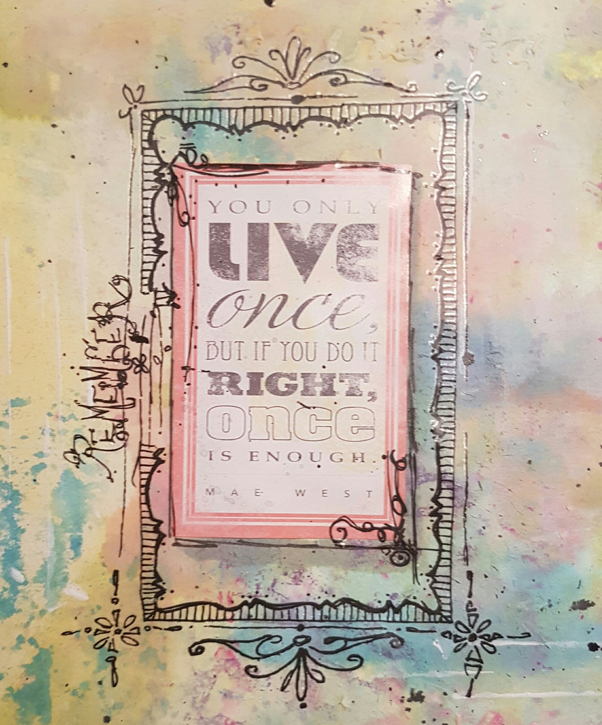 I finished the page off with a sticker quote and some rub ons and doodling. I also flicked some black ink onto the page and added little white lines using gesso.