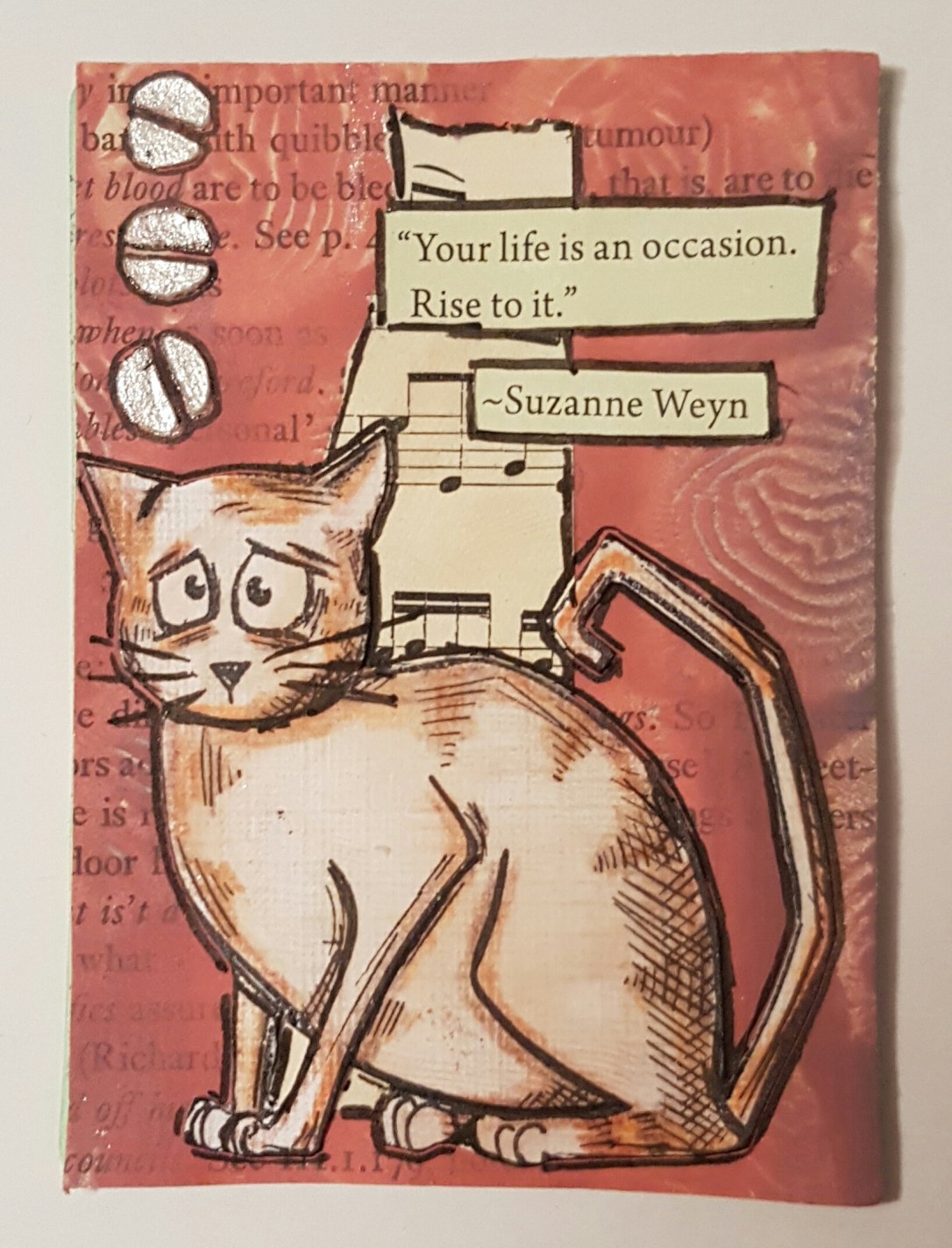 Gelli print on book print and a Crazy cat Coloured with Spectrum noir pencils! Fun!