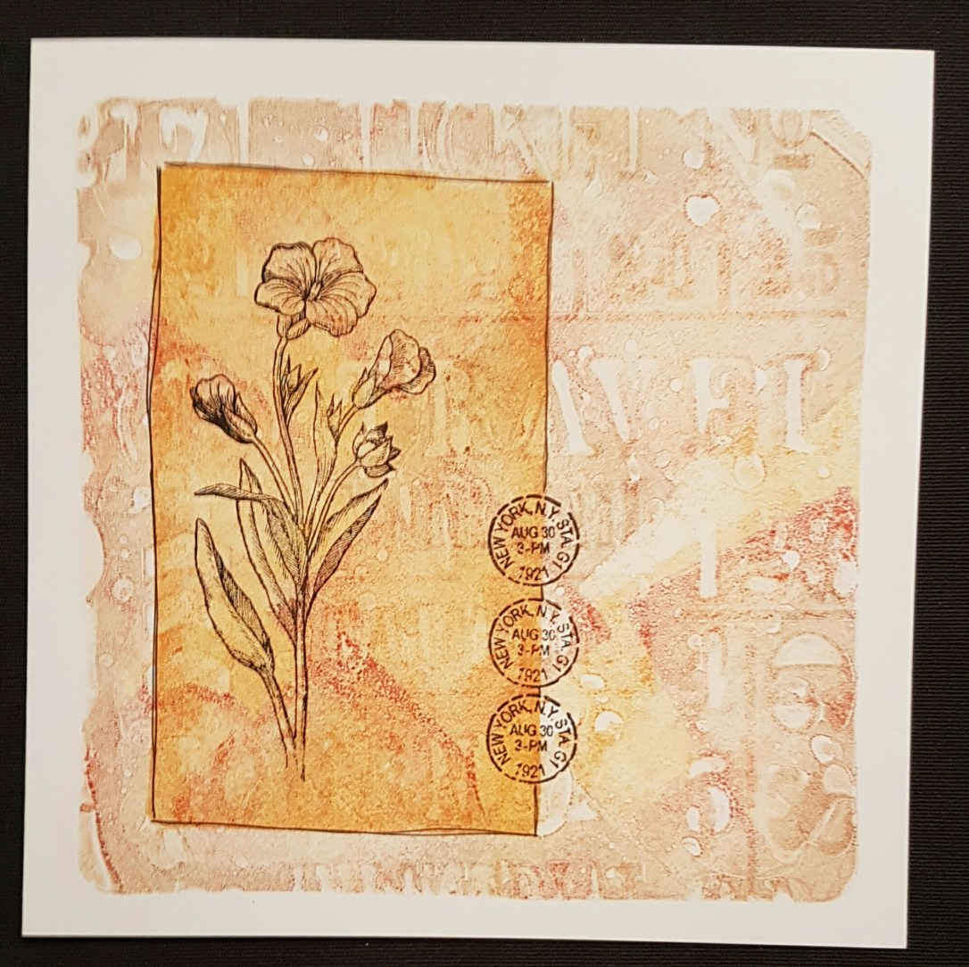 So last night was playtime at my house with Gelli plates galore. And I actually made stuff too not just demonstrated…. I made a couple of cards… the first one will be a mothers day card when I get round to adding a sentiment.