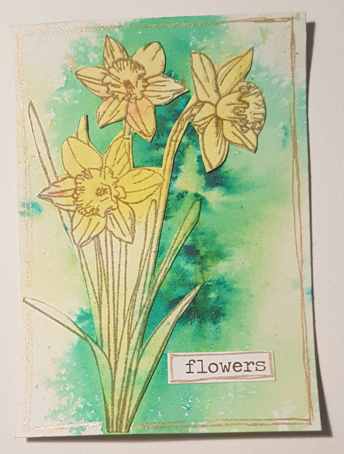 I used the Brushos to sprinkle through a stencil. This was Gamboge and Lemon.