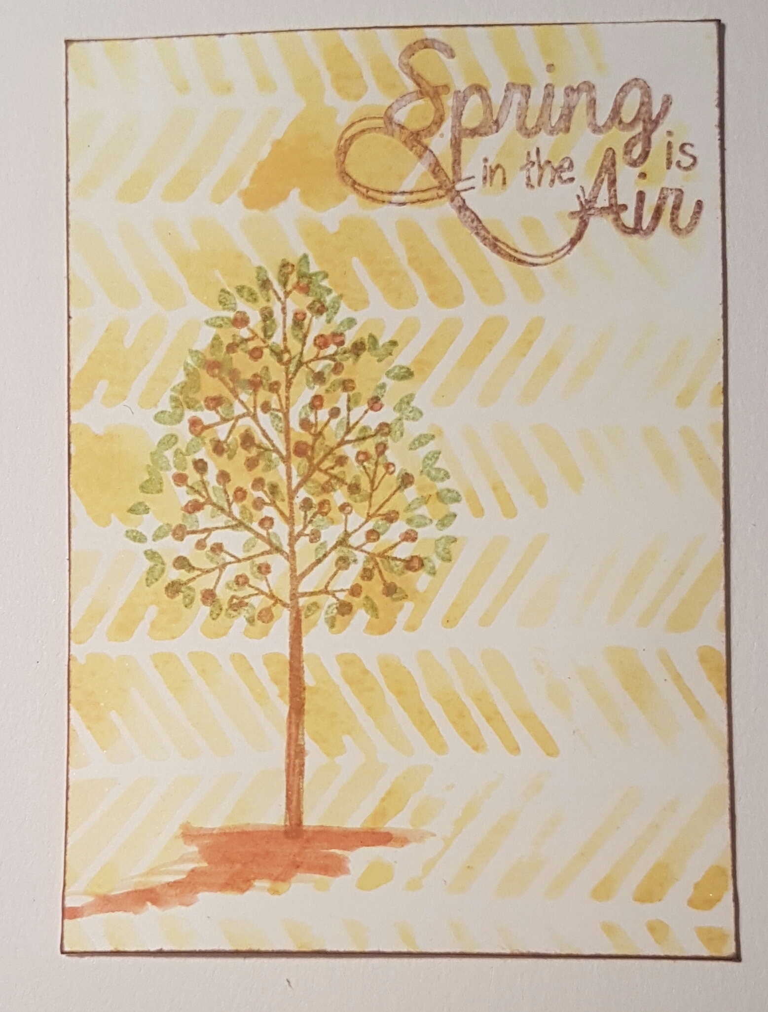 Next I used Brushos to stamp the background. I love the way this works and the watercolour effect of the stamping. I finished with a Totally Trees stamps and then a bit of water colouring.