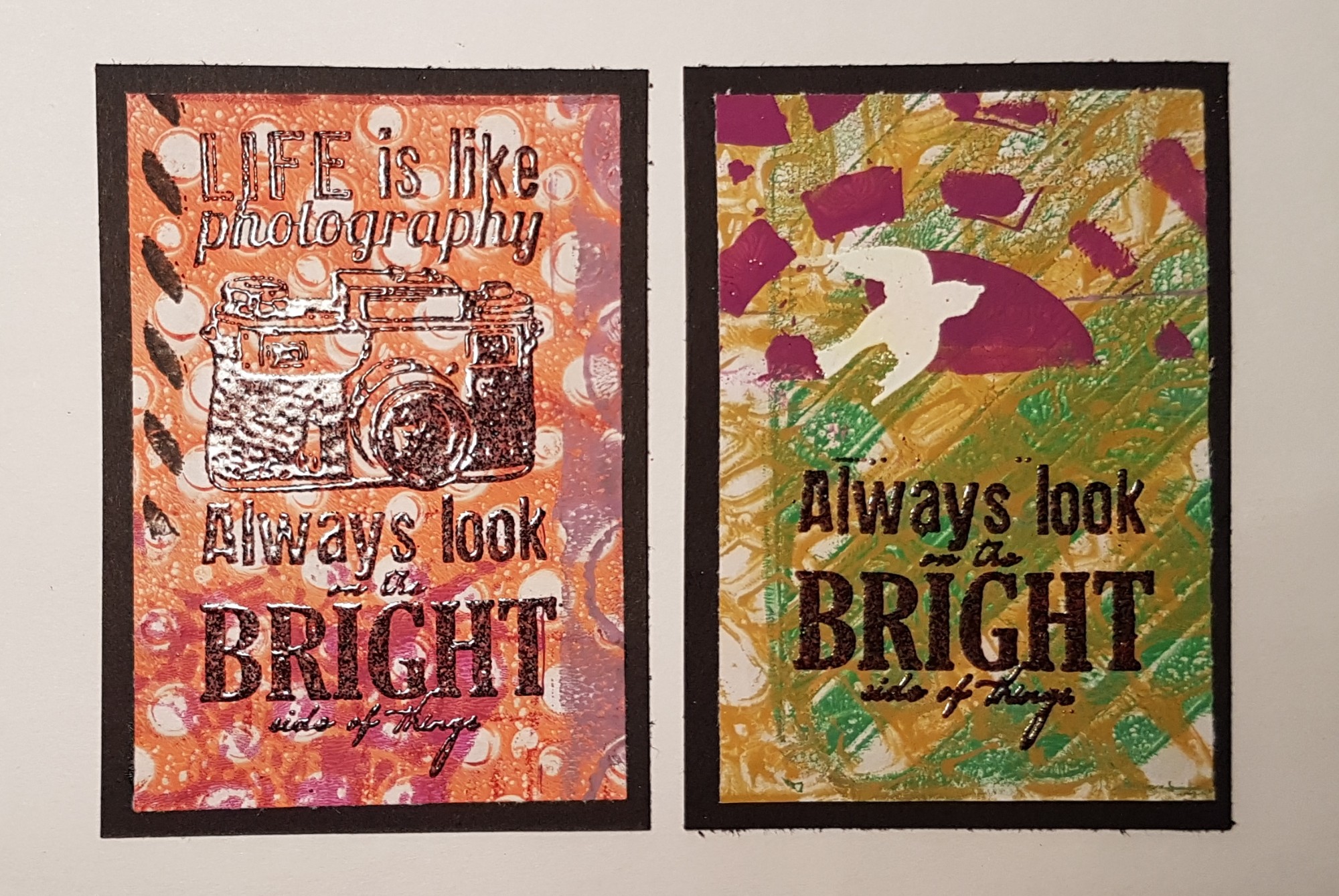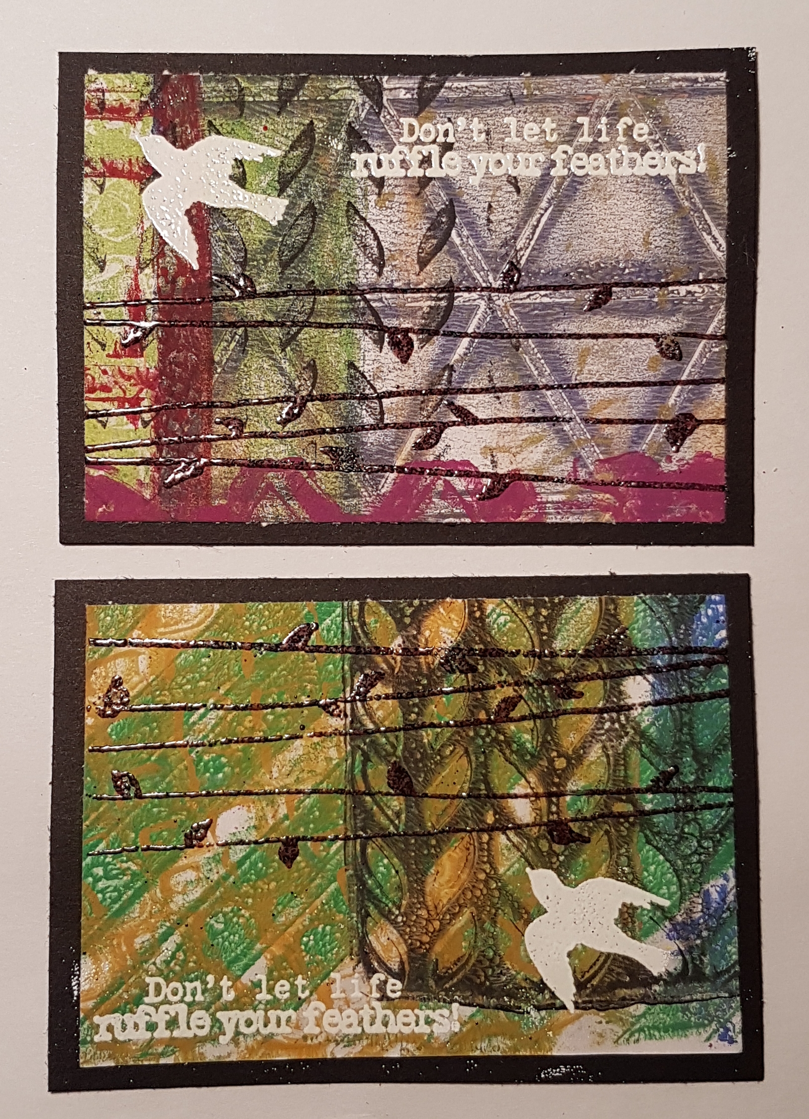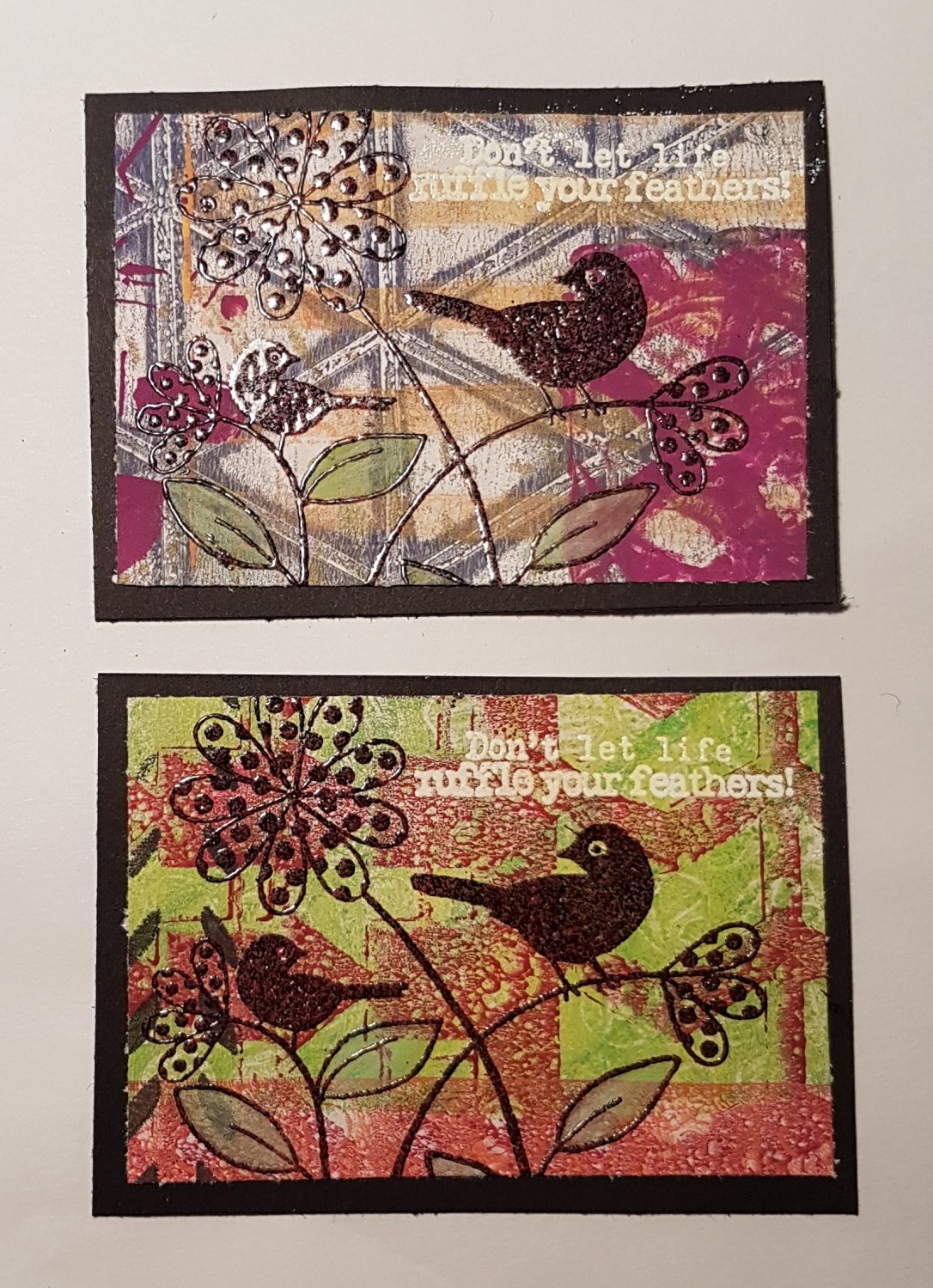 The Artemio stamps were used for these two as well. Love these images even if they are a tad too big for atcs. But these partially stamped images worked fine.