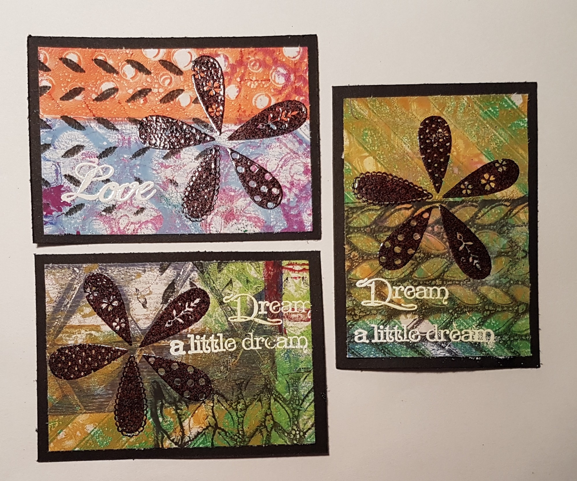The next three were using the big bold flower stamp from Artemio with different patterned petals.