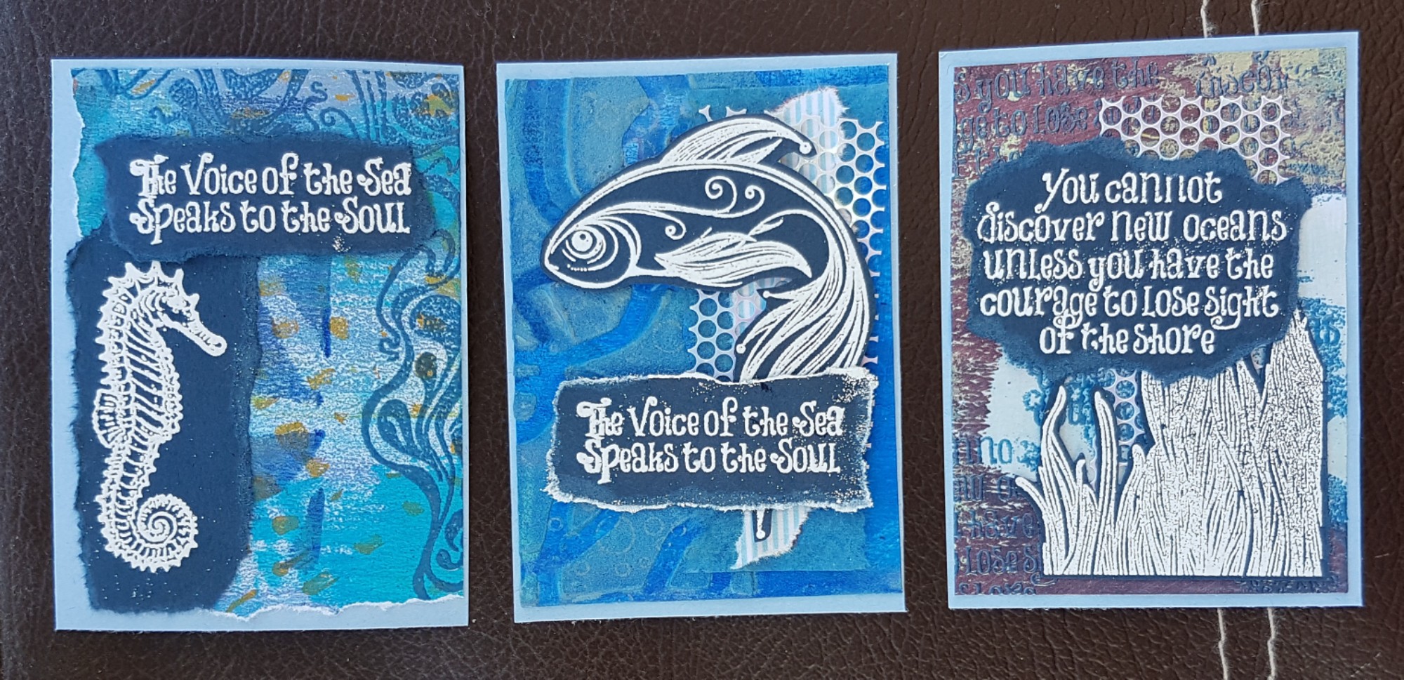 I’m up early and still feeling poop as I adjust to medication  but thought I could do something positive and write up a blog post. Here are three ATCs made for a swap where the theme is The Blues. I went for a sea theme but started by grabbing three off cuts which had blue themes.