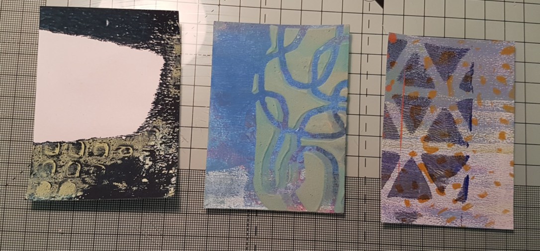 The first and third were gelli print off cuts and the middle one was a palette with some modelling paste through a stencil.