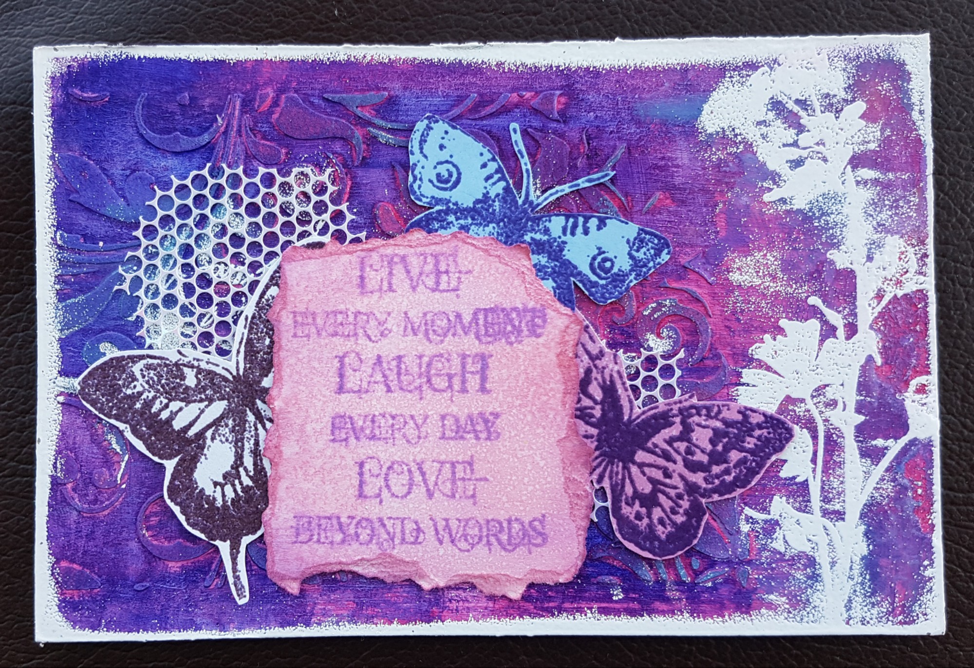 I then added the sequin waste layer and some embossed Tim Holtz butterflies and then the Indigo Blu sentiment which I stamped and coloured using the distress oxides.