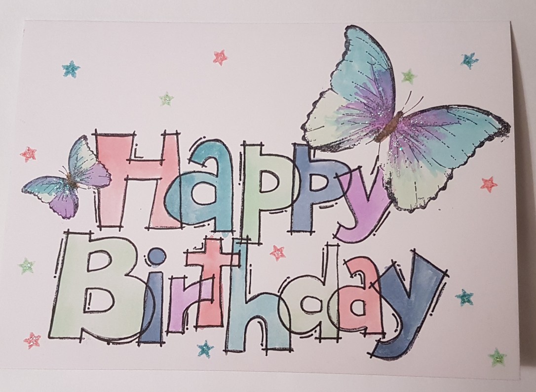 I used distress oxides to watercolour the butterflies and the letters. Then I stamped the little star using the same colour inks. I then added some stickles to both the butterfly and the stars.