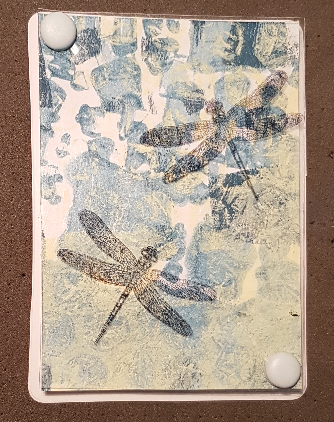 This was a gelli plate painted background that I loved as it was so I added the dragonflies to a piece of acetate using Stayzon and mounted the layers using brads. I then mounted it onto a base with some craft foam to raise it off the back.