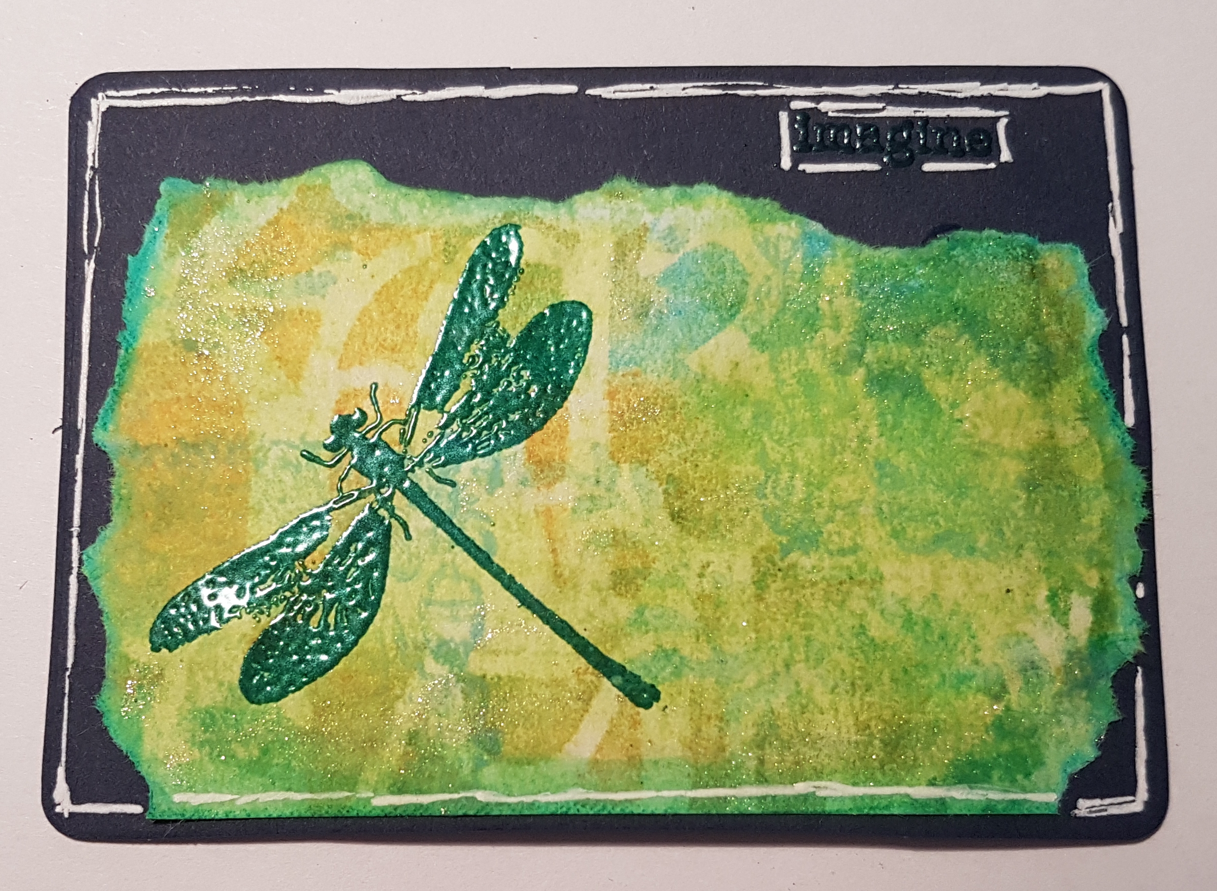 This started life as a scrap from an inky gelli print and had additional distress stains added and then the dragonfly embossed using an emerald embossing powder. Then mounted onto navy and doodled the edge.