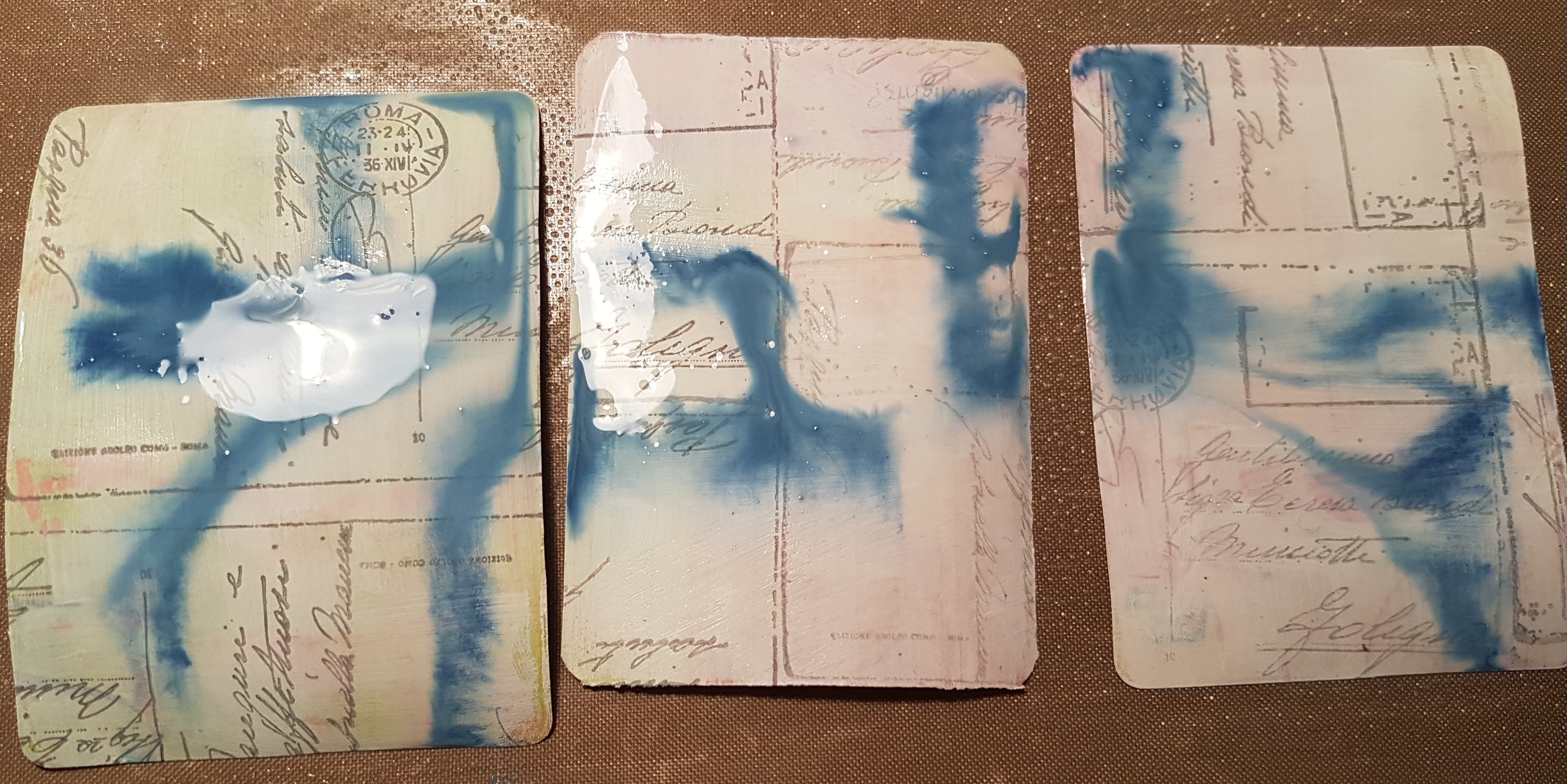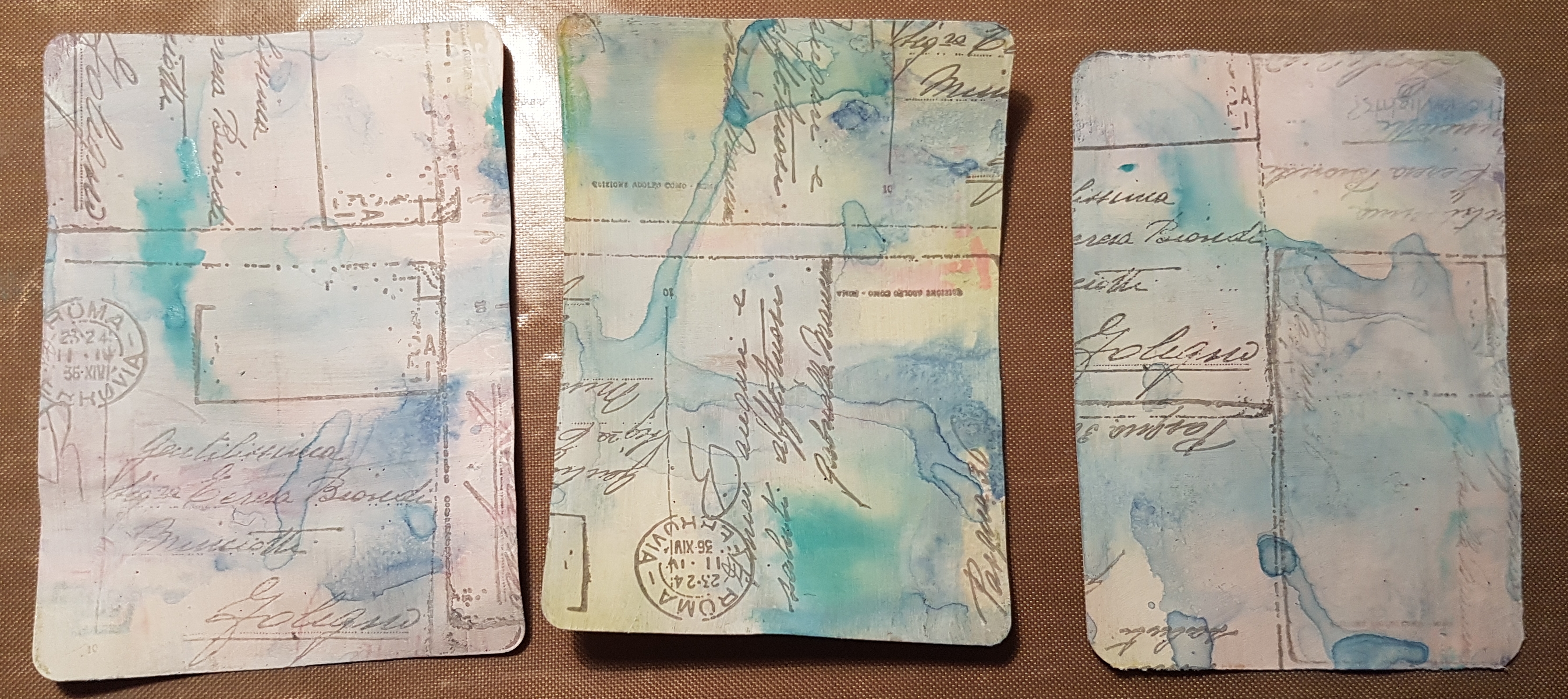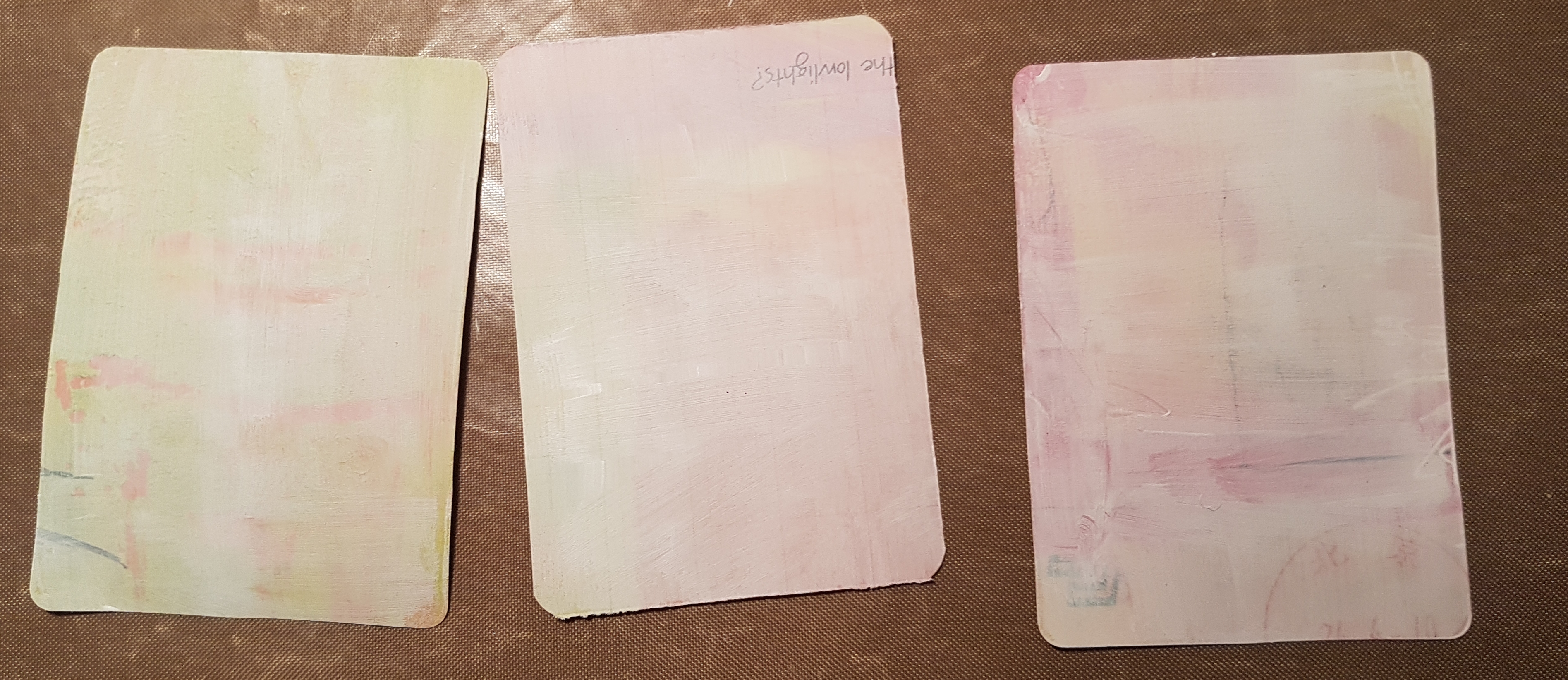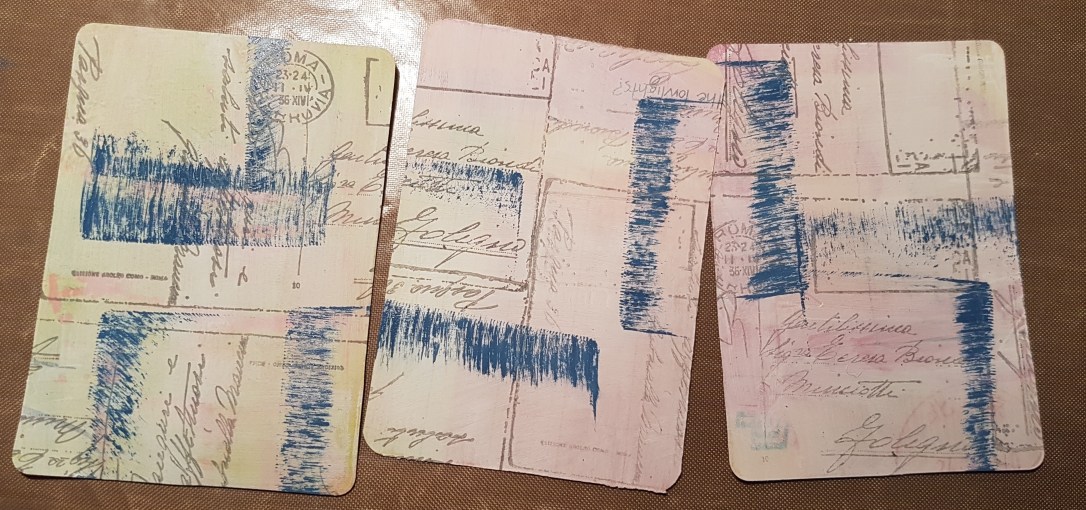 I started with three bases made out of some patterned paper that is quite grungy… I then gave them a coat of gesso.