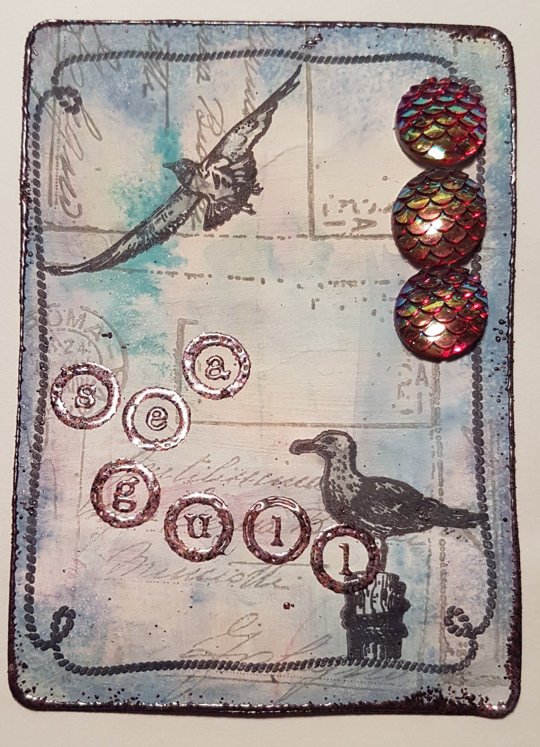 The first one has the seagulls as the feature images. I added the stamping and then added the title with some letter stamps and embossed them. I did the same with the edge. I then also added the shiny fishscale type gems.