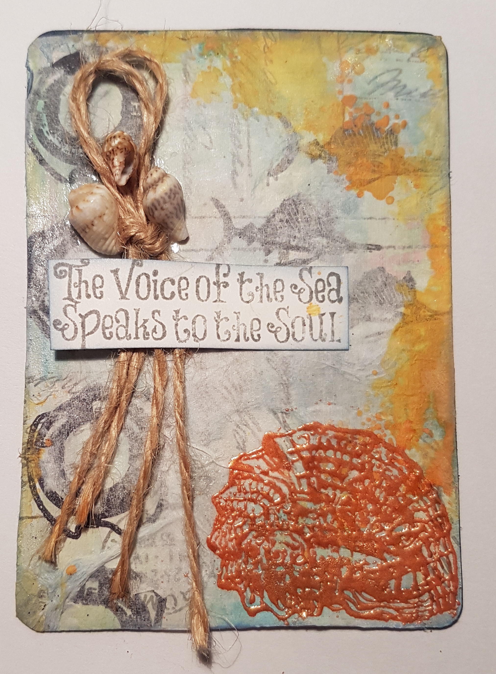 The last one had a different look as the colour underneath is a little bit more green. After the stamping I added tissue paper to soften the images and add texture. I also then added the embossed shell image. I also thought it needed some more contrast colour so added some Spiced Marmalade distress oxide ink.
