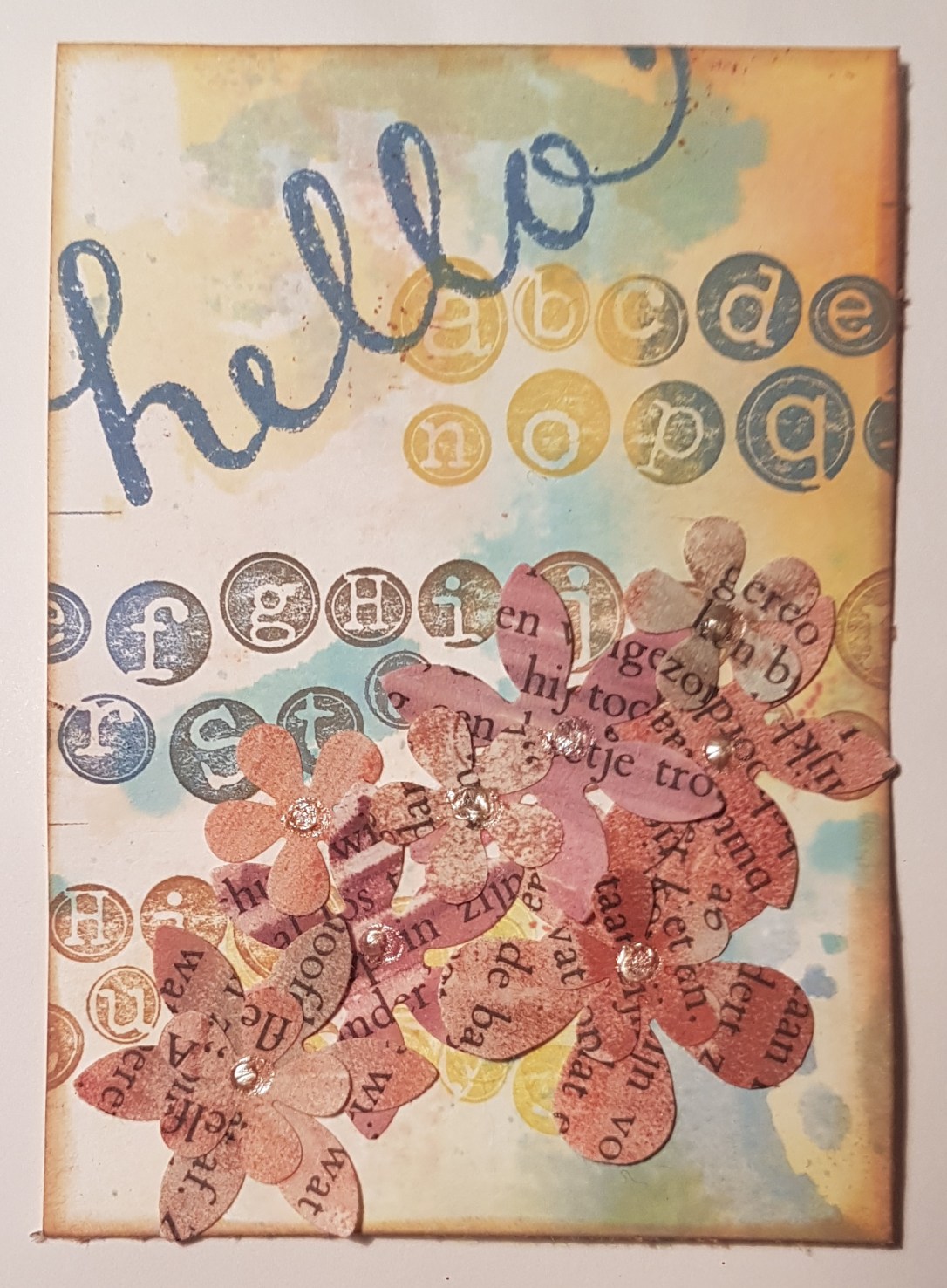 I finished it off with some flowers I got as an extra in a swap and a little additional stamping of the title.