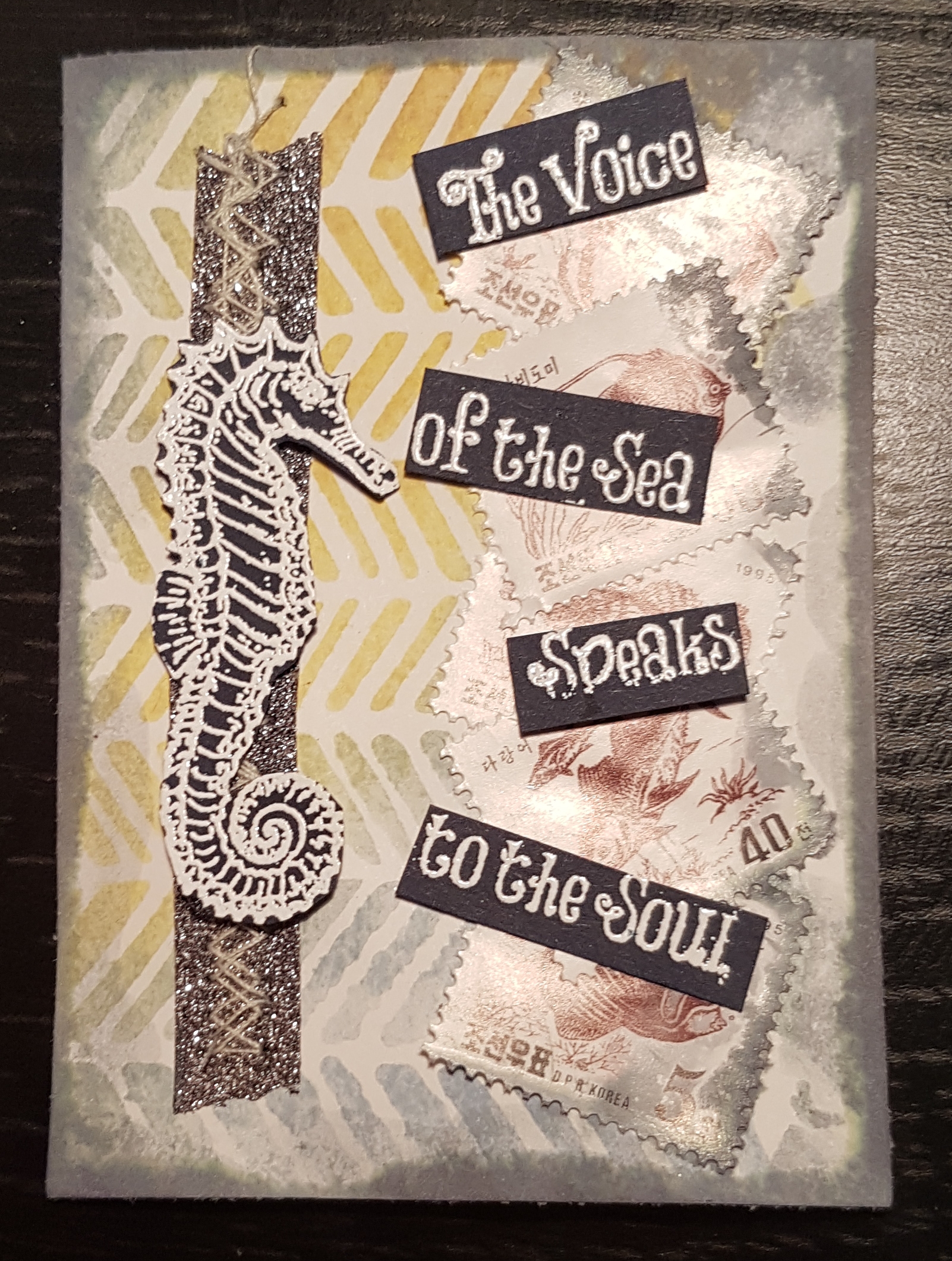 These two ATCs were made from the handcarved stampin up stamp I did using the stamp platform. This first one I added some fish themed stamps and then the embossed seahorse. I also added some washi tape and sewing just to add some additional elements and then the title. I finished off with a generous amount of distress oxide watered down for the edges and over the stamps.
