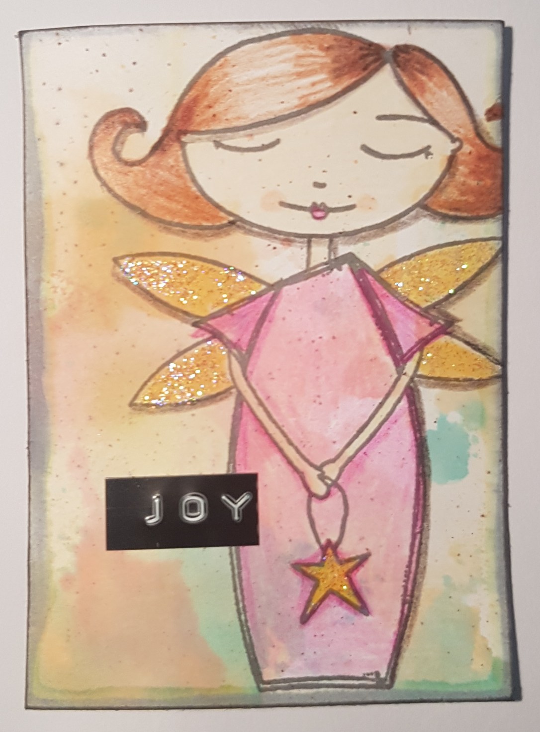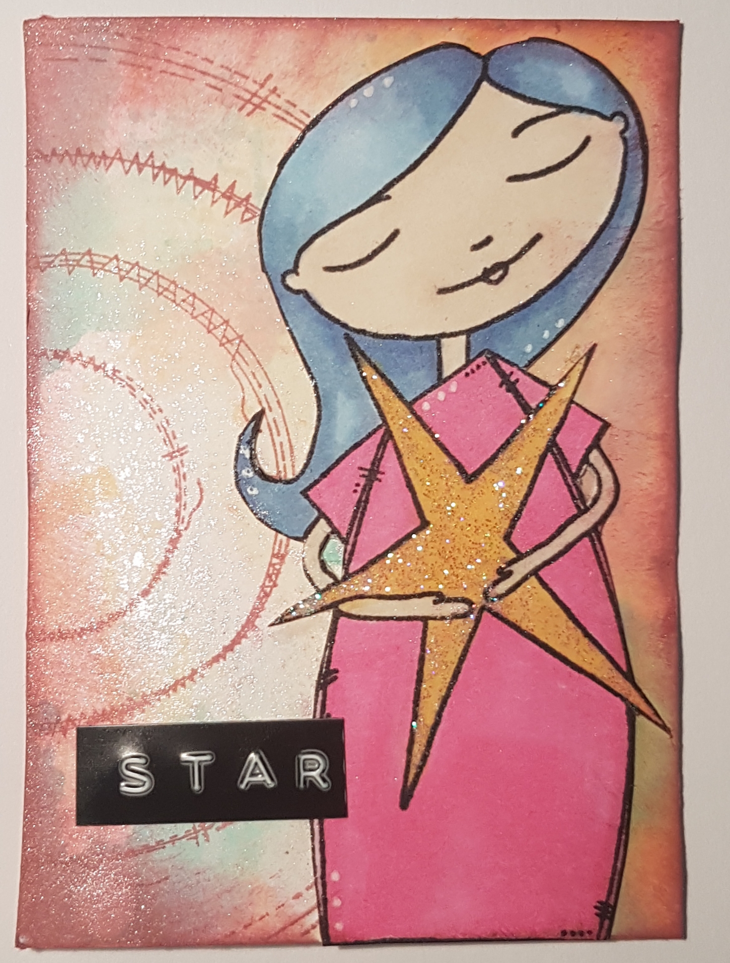 This is coloured with promarkers and then collaged onto the background. The background has a spritz of the mica spray and then stamped the stitched circles from Artful Days Goodie box.