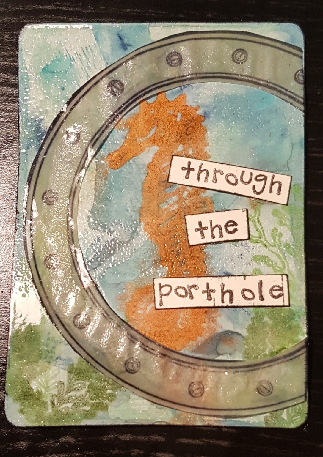 I added gesso to a light green piece of card then added layers of distress oxide. I then stamped the seahorses and the seaweed.