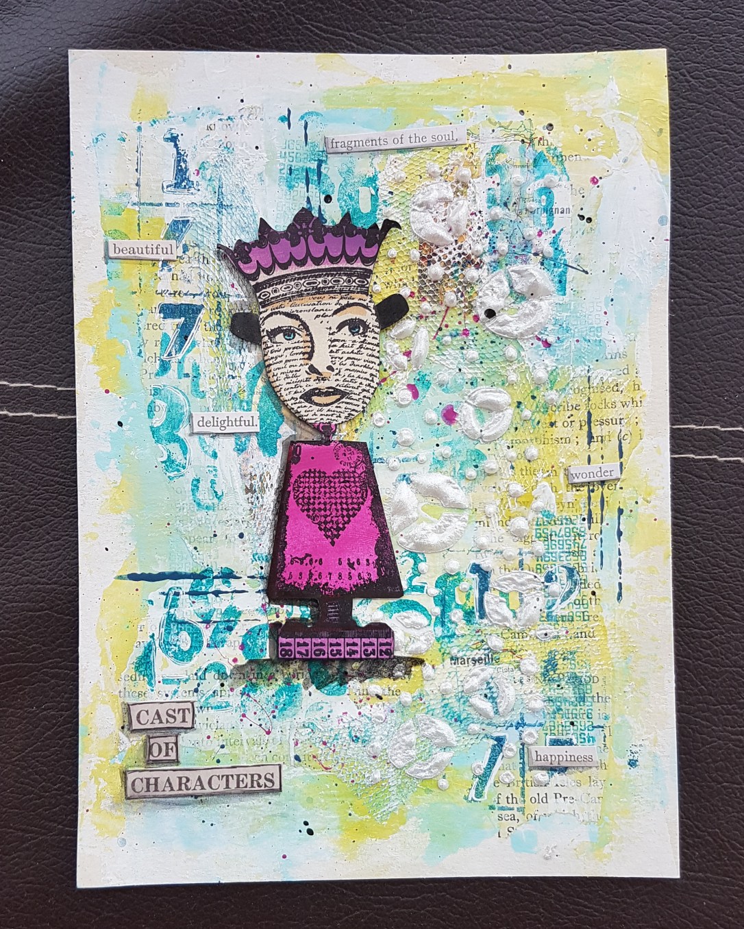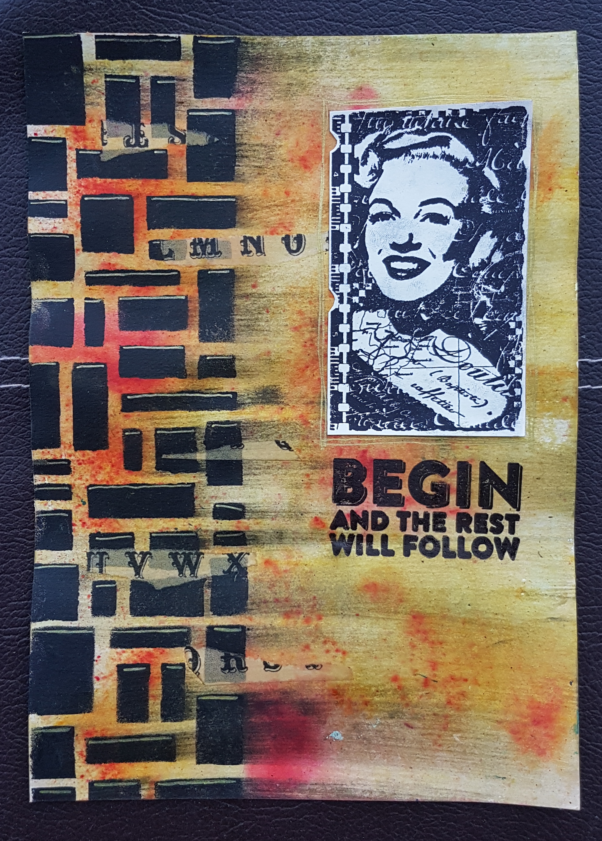 I added black gesso through the stencil, then some washi tape and then lots of bright brushos and added Matt medium to stabilise them. I love how this dragged some of the gesso across in streaks too.