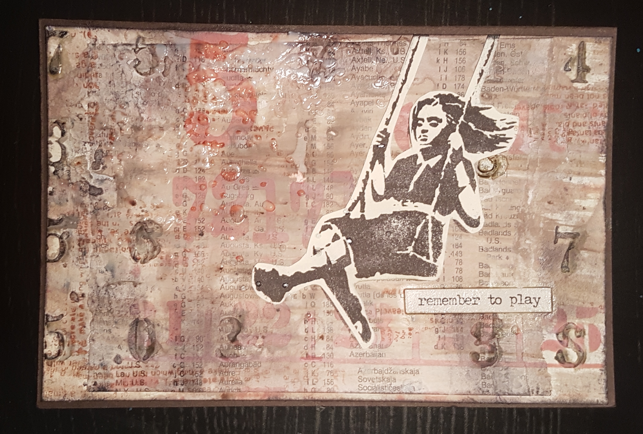 Then some gesso and some Bistre powder and water to create the vintage background. I then took an Andy Skinner stencil and added some more numbers using distress oxide inks.