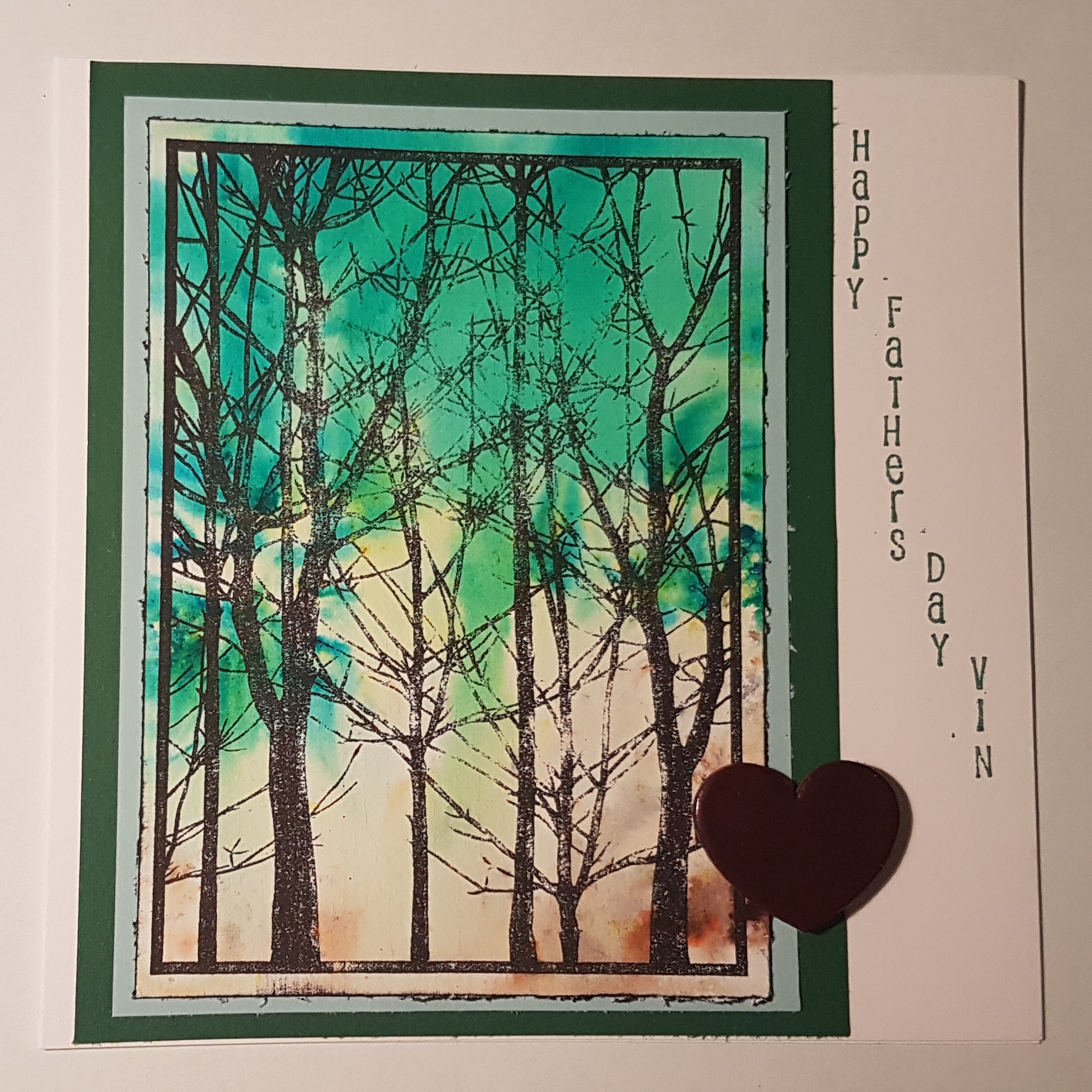 I did change it up from the original a bit with the heat embossed heart, the additional panel to frame and the stamping on the side. But otherwise it is the brushos background and the Indigo Blu bare forest stamp.
