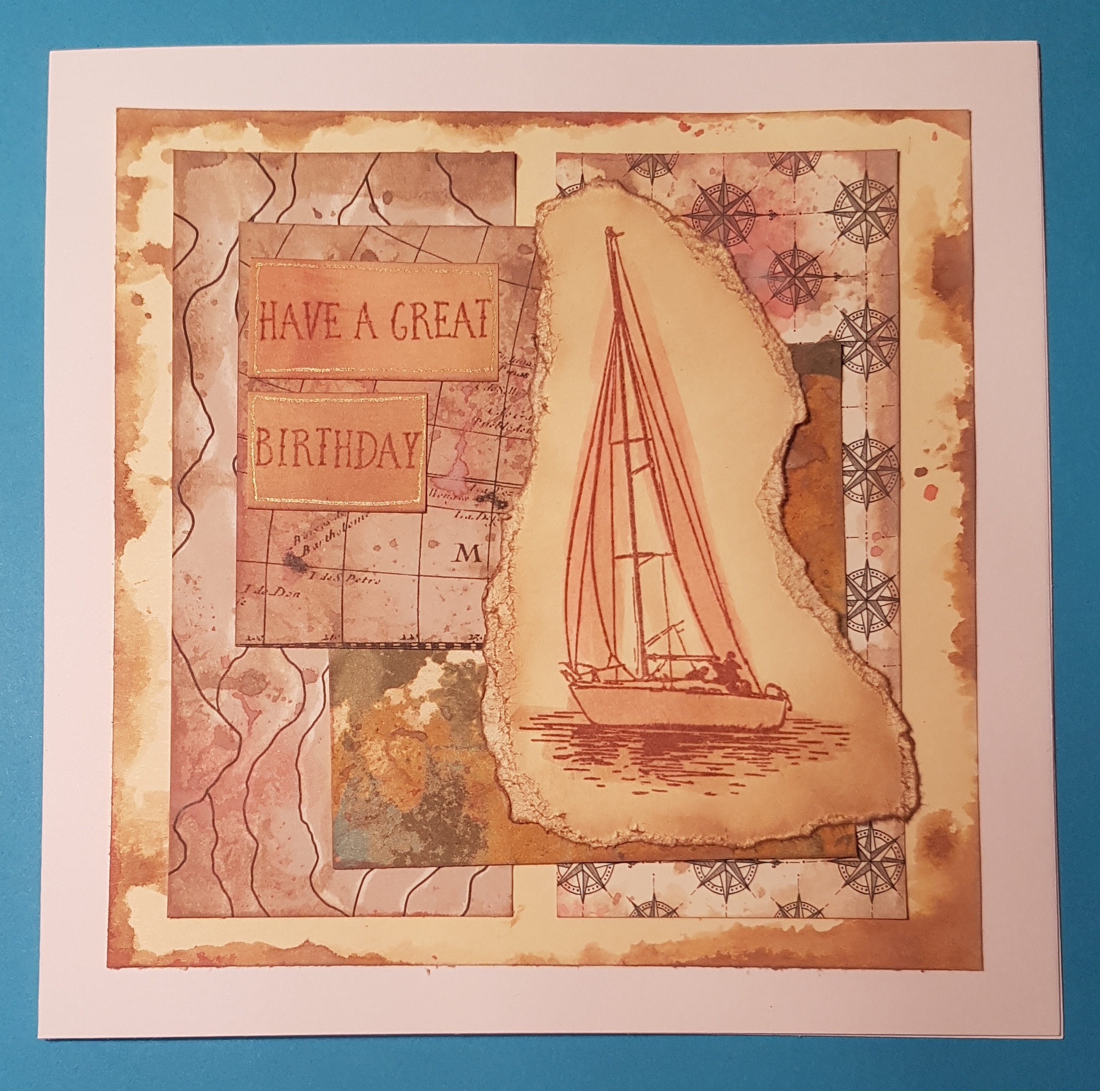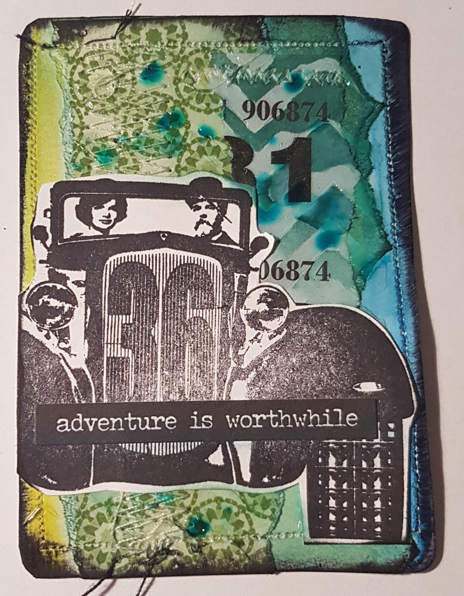 I used the green torn paper from the hot air balloon card and the car from the painted card to create this. I just added some sewing and some texture paste through a stencil … oh and some raffle ticket bits too.