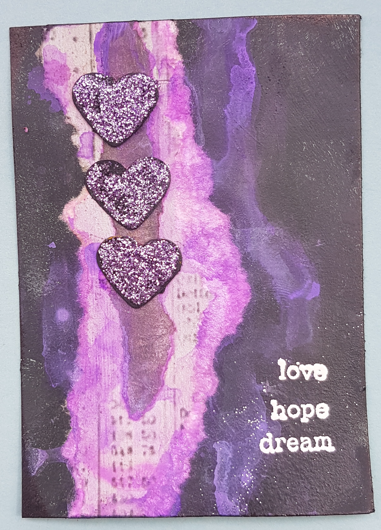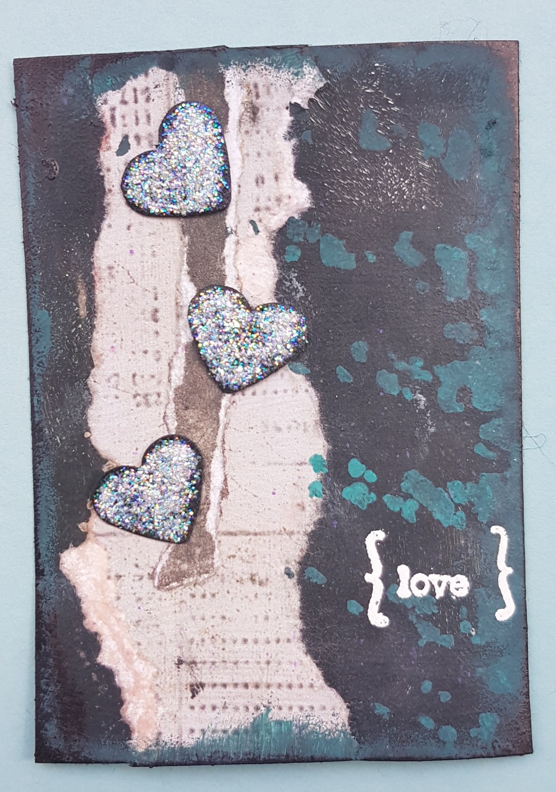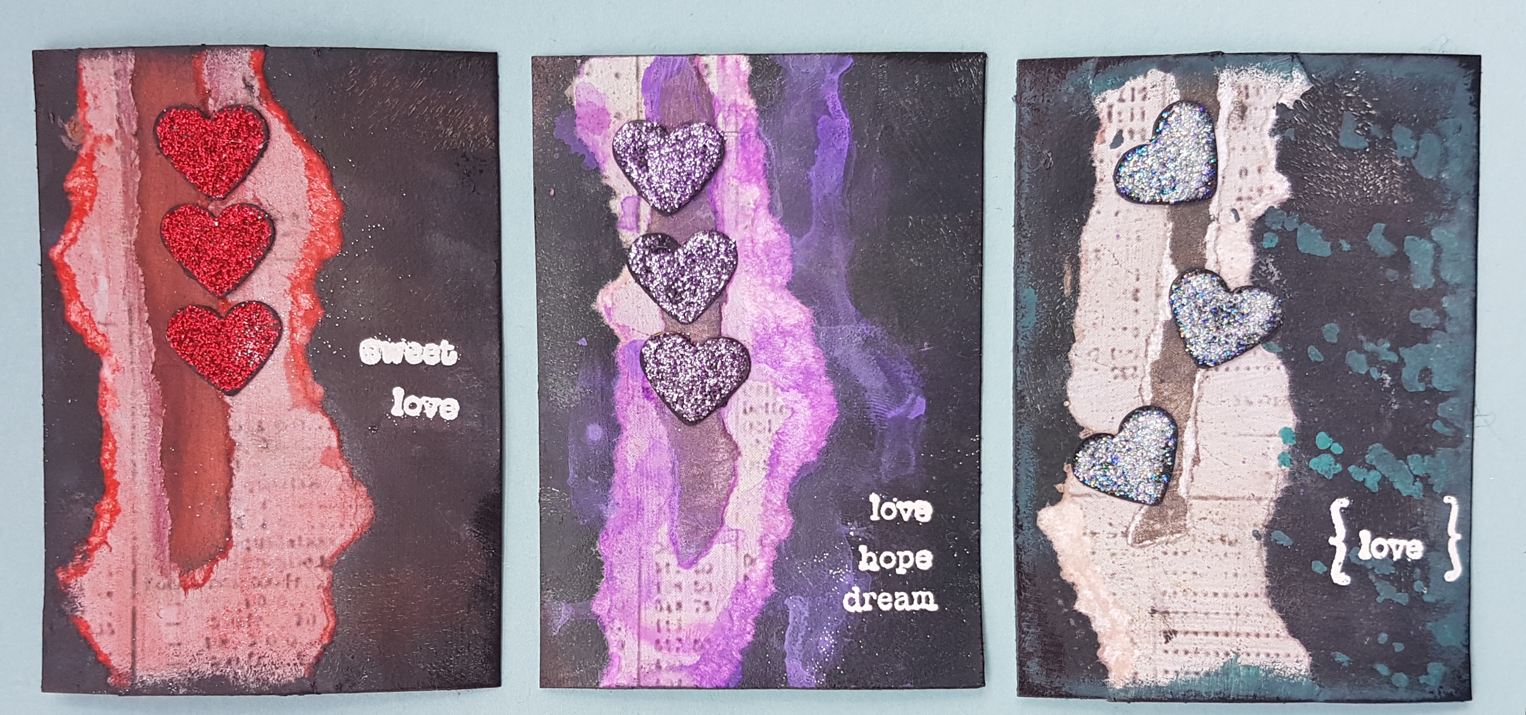 Here are the three ATCs I made from some scraps and some punched hearts I received in a swap. I filmed the process… Here is the link to the YouTube video.