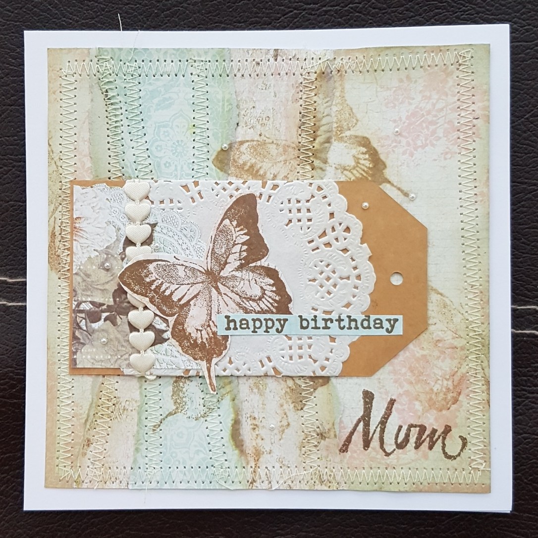 I chose three papers from the same pack. Unfortunately forgotten what the name of the pack was and layered them up, inking each of the edges I tore.  I stamped the Tim Holtz butterfly a few times lightly and spritzed it with water to oxidize the background… yes I had used my beloved oxides. I let it dry and then did a mammoth amount of sewing on the machine. I thought this gave it a nice patchwork type effect.