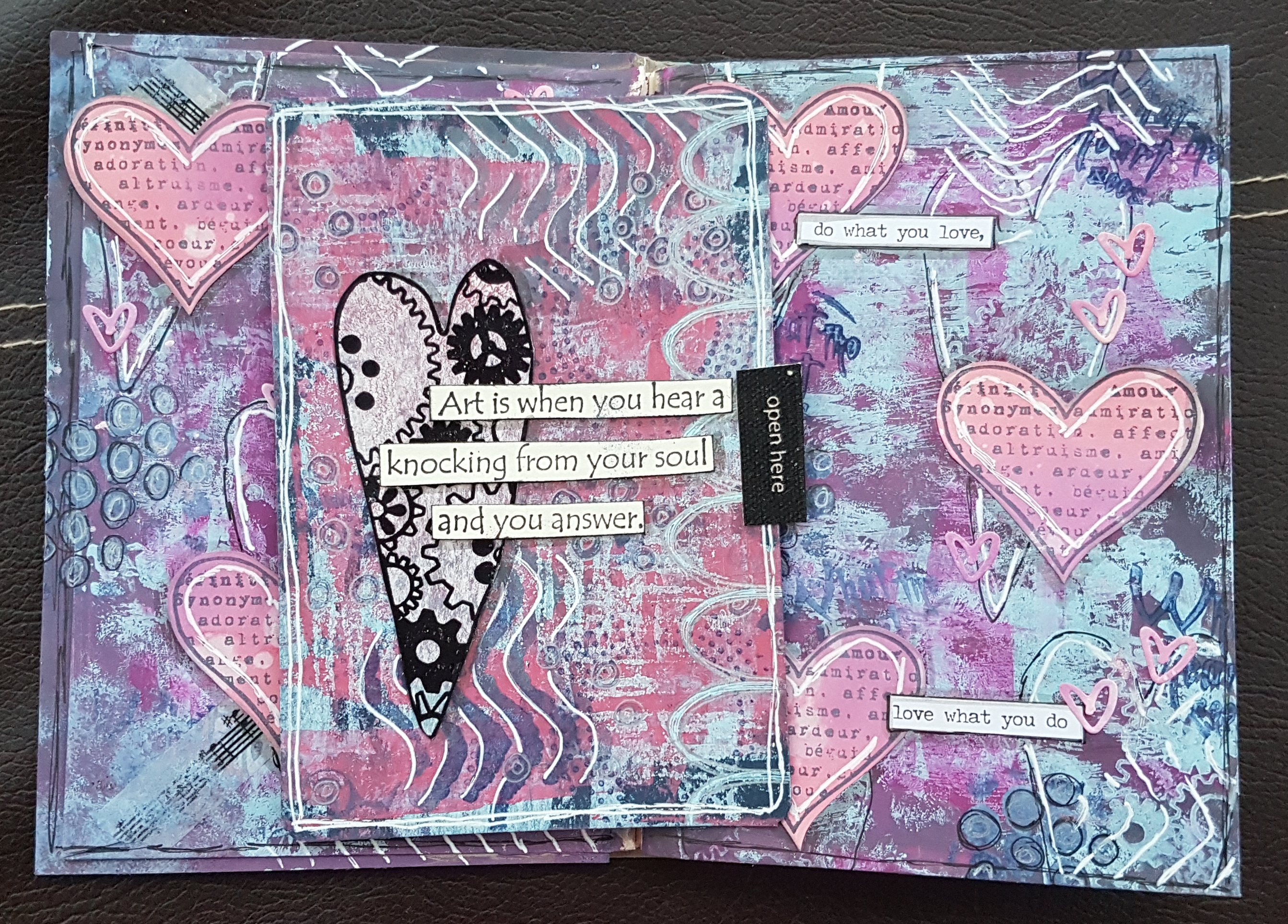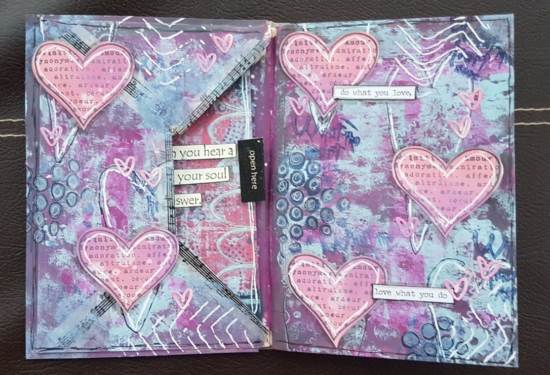 Then the inside page I went for a purple colour scheme. I also went a little Darcy heart crazy! Then inside the pocket created by the envelope I added a card onto the back of which I put my “rules” for the journal.